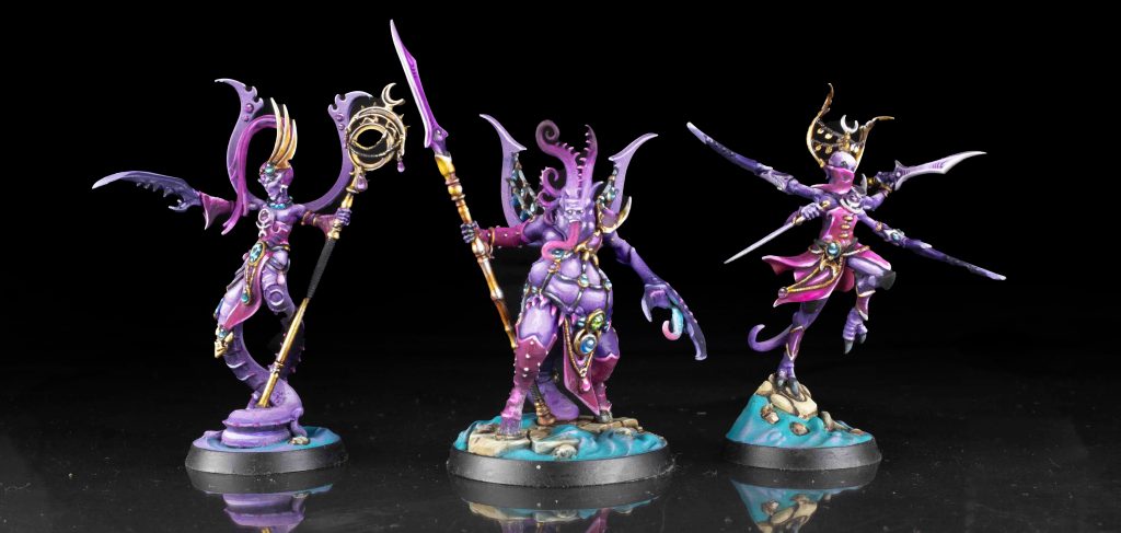 Starting off with some of those daemon models are the oddly aquatic Thricefold trio. These are great sculpts with a lot of character, which unfortunately limits them a bit for mortal repurposing.The staff and topper on the tentacled demon is gorgeous and one I’ll be bringing over for my Slaanesh Helot Cult witch. The rest of this model? Not so much, with odd proportions and overtly demonic features. You could potentially hack off the torso to swap something else on top of the snake-like…stuff going on below, which I could again envision for a particularly “gifted” witch or leader.