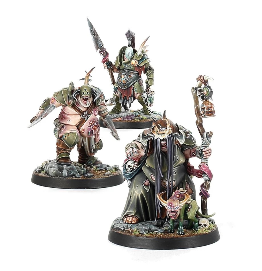 You could make a strong argument for these three Nurgle mortals as the GOATs of Underworlds models, and they’re a treat to kitbash with as well. All three are striking, unique, and worthy of a good clean up. It’s also uncommon to get models on the heavier side of things, which help these stand out even more.Fecula Flyblown leads the group, with worn and tattered robes draped over her bloated and curvy figure. She’s got a bit of a hunched back leading to a large metal shoulder plate on her left side and various trophies strung around her waist. She is clutching a staff roughly in the shape of a wooden scythe with both her normal human hand as well as a long demonic tentacle, while pointing forward with the other. She’s as good as you’re going to get for a mutie leader or plague witch base, and has a lot of applications if cleaned up a bit. Plus, there’s the…cat…thing. We like it!