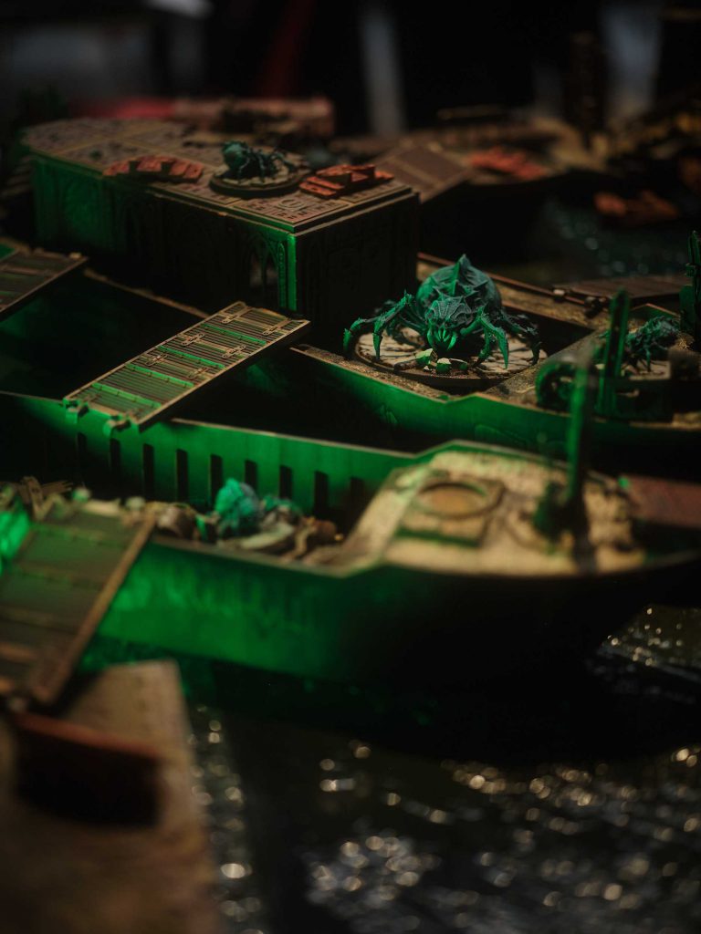 That last round played out on a lovely Sump Sea board crafted by @techmarine_terry with a custom scenario he and Constantin tweaked from one found in the fan-made “Book of the Sump” supplement. I was paired with Tim @pile_of_grey for an uncharacteristically friendly Venator showdown. We were tasked with hunting Sump Spiders spawning across four derelict boats, which quickly got interesting when the first boat sank off the board at the end of the first turn.