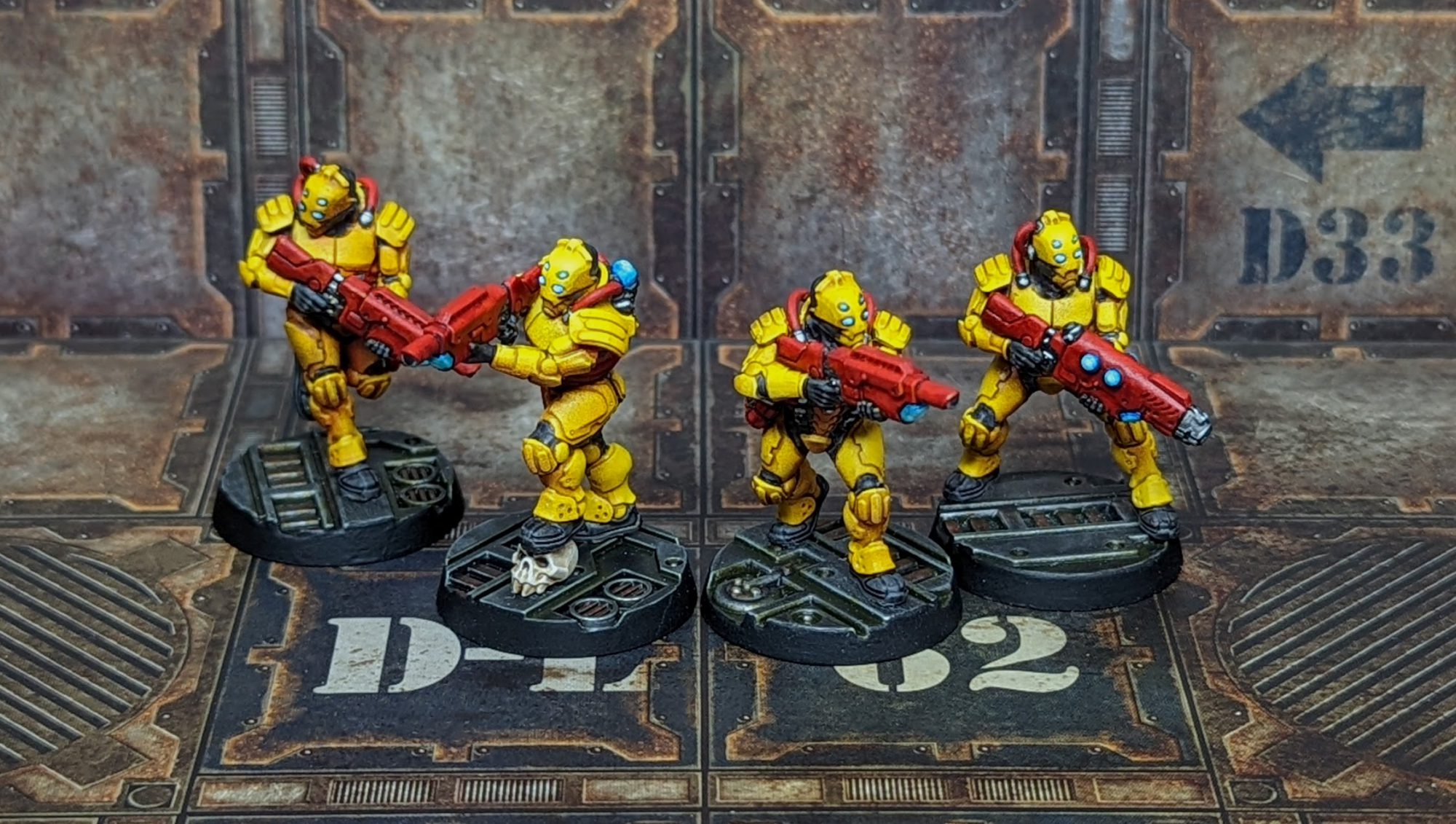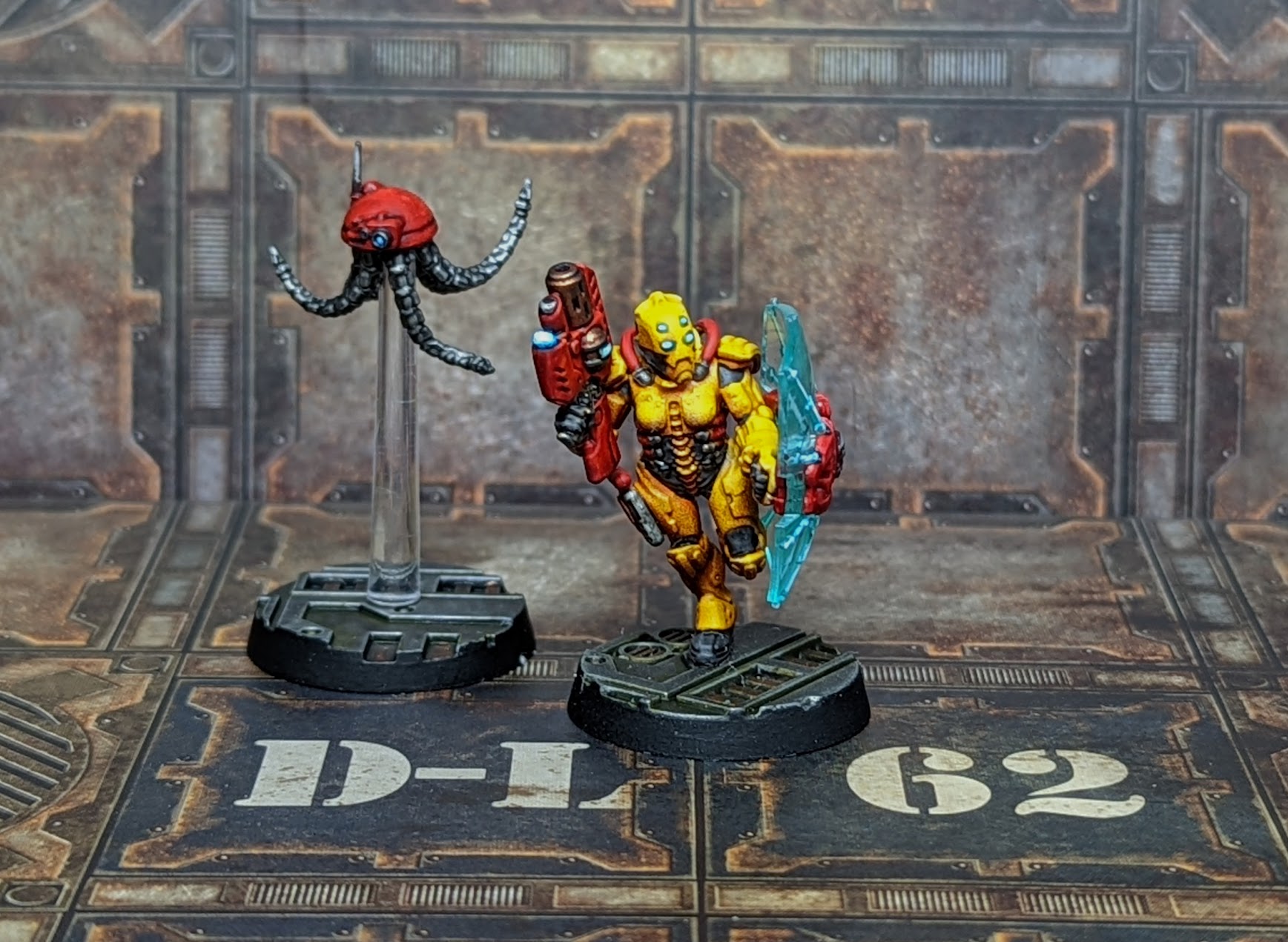 Van Saar Prime and "Grapplehawk". Credit: Kevin GensonI've always enjoyed the idea of Van Saar, and while playing with a scheme for Marines Malevolent I came up with a really fun method for painting yellow. Goobertown Hobbies has a ">really good video on it, but you basically start with an undercoat of pink and then add a zenithal spray of white overhead. Yellow is my favorite color and between looking like bugs and Murder Hornets being just one more thing about 2020 it seemed like a logical choice.