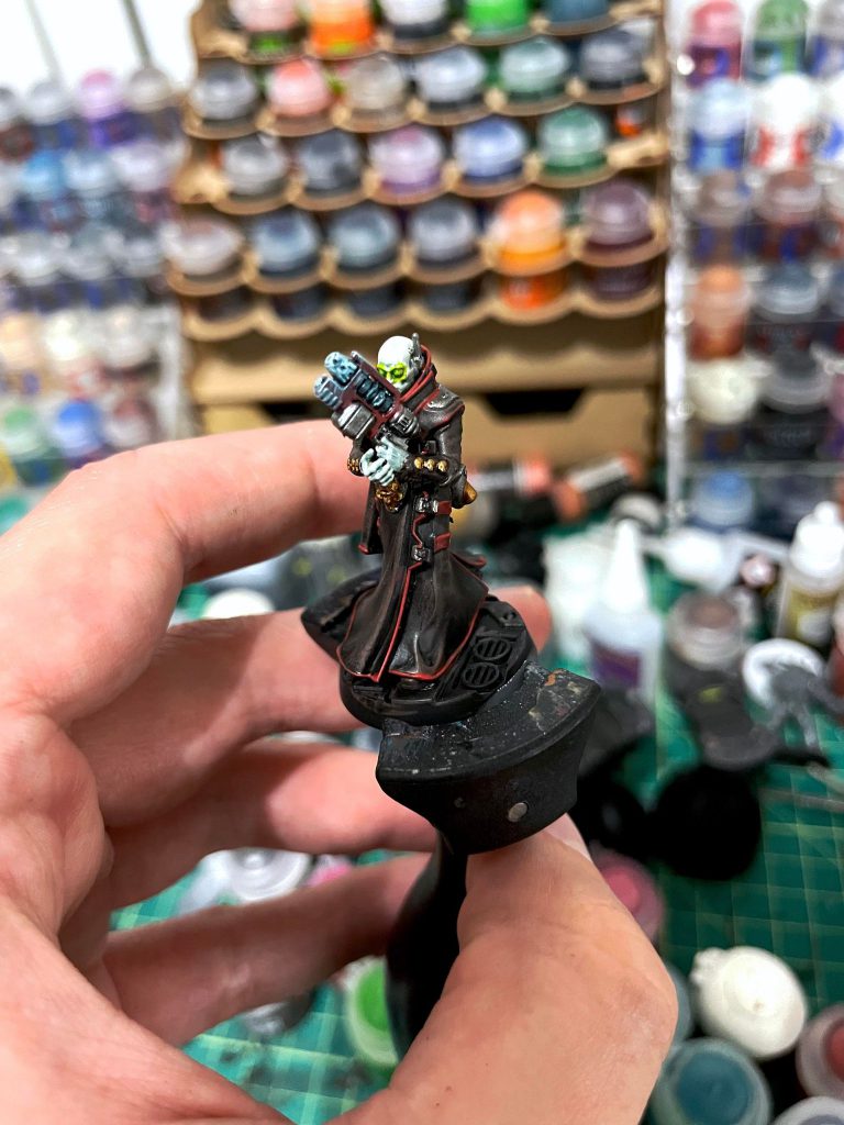 Take the coat, for example. Its a dark brown that almost is black at a few points and looks great on Delaque models. To do this, I just put down a coat of Thondia Brown and hit it with some thinned down layers of Black Legion contrast. Then , Drybrush back up the Thondia brown and add a light drybrush on Thondia brown on the highest edges. I find a method like this is the easiest way to paint capes and cloth in general, and it turned out perfectly on the delaque here.