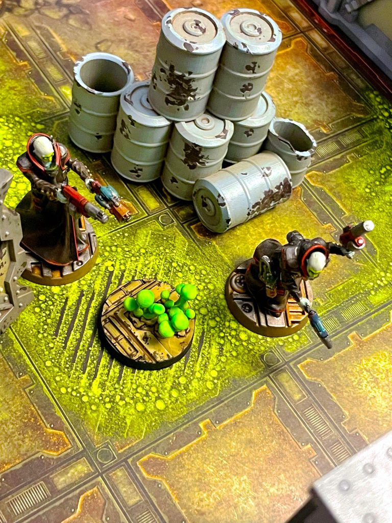 The campaign featured Greg’s Orlocks, Andrew’s Enforcers, and Luke’s Chaos Van Saar. In any straight up fight, I didn’t really stand a chance against any of these gangs with Delaque. My basic gangers have a very unimpressive gear list at gang creation with middling stats, and because of this my gang was mostly juves to fill out my roster with only a handful of gangers to get access to an autogun and grav pistol later on. This meant most my bozos were running around with cheap Autopistols and couldn’t hit the broad side of a bard with them most the time, so there was no way I could win a fair fight in a shootout with the firepower these gangs brought to bear.