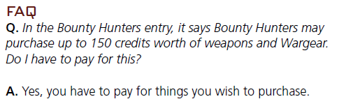 - A Shivver’s 10-11 roll of A Mysterious Stranger allows a gang to hire a Bounty Hunter for free for the next battle. Do players have to pay for their equipment? If so, what happens to that gear after the battle? We’ve wrestled with this question time and time again, and the Equipment section on p67 of this book states “In addition to their hiring fee, a BH may purchase up to…”, indicating to us that the free Bounty Hunter only knocks the initial 80 credits off of the cost. The FAQ supports this reading, but does so in a frustratingly cheeky manner. We’re not even sure what the Rules As Intended are, here.
