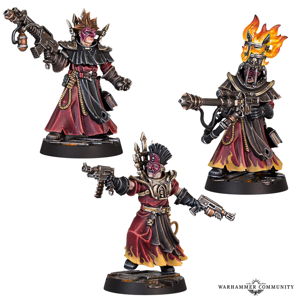 As we’ve mentioned above, Redemptionists draw from a mostly-different armory than their Cawdor counterparts. There are a few familiar sights, but the new stuff is awfully shiny:- Exterminators are 1-shot hand flamers that can be attached to Basic weapons and chainaxes. For 15 credits, the threat of indiscriminate template fire and Blaze will give anyone pause. Approach at your own risk!