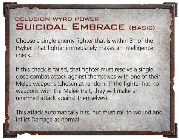 Extremely short-ranged powers with a focus on disabling the enemy. Cause insanity, mess with Ready Markers and Activation order, or incite a spreading panic. For a sheer Nietzschean thrill it’s hard to do better than Existential Barrage, which causes an enemy to become Broken and immediately Run for Cover. Then, if they happen to be within 5” of any allies, those fighters must make a Nerve test or Break as well.The Delusion