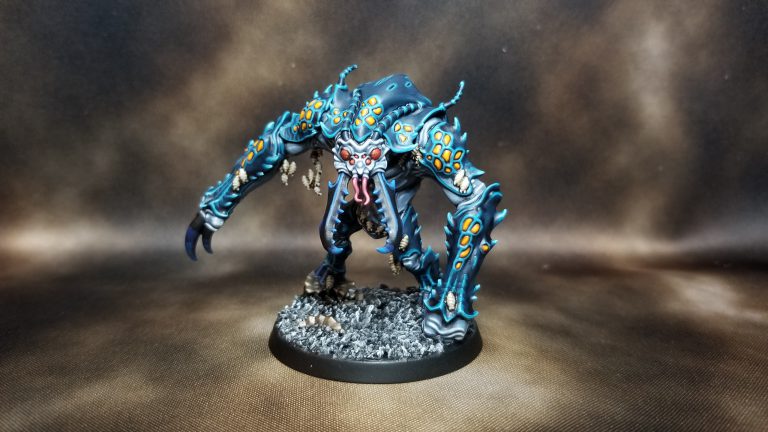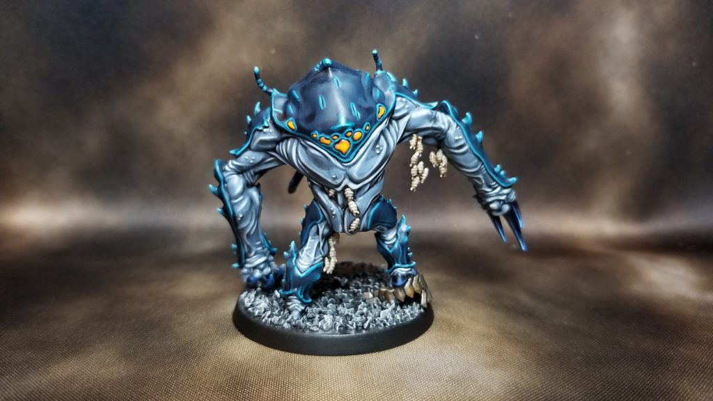 I started with my usual base coat of AP Bone primer over AP Leather Brown. I dry brushed the entire model with white. After that, the flesh bits got a coat of Skeleton Horde Contrast and the carapace a coat of Cygor Brown Contrast. Next, the larva and tubes on him got a coat of Iyanden Yellow Contrast while the noodley bits get a coat of Blood Angels Red Contrast.
