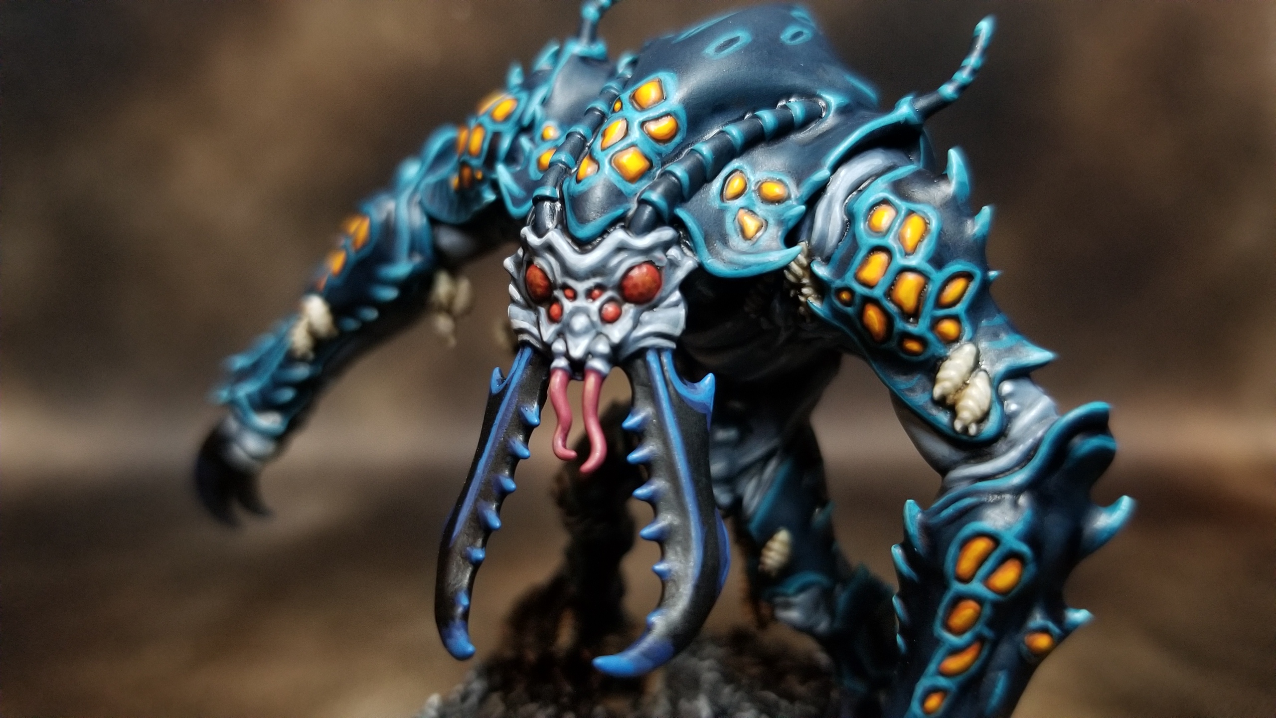 Fleshy Bits: Based with Cadian Fleshtone, washed with Reikland Fleshshade. Layers were built up gradually with a mix of Cadian Fleshtone and Eldar Flesh, thinned down heavily with Lahmian Medium. Final highlights of pure Eldar Flesh, with a bit of Agrax Earthshade to add more definition where the flesh met the carapace.