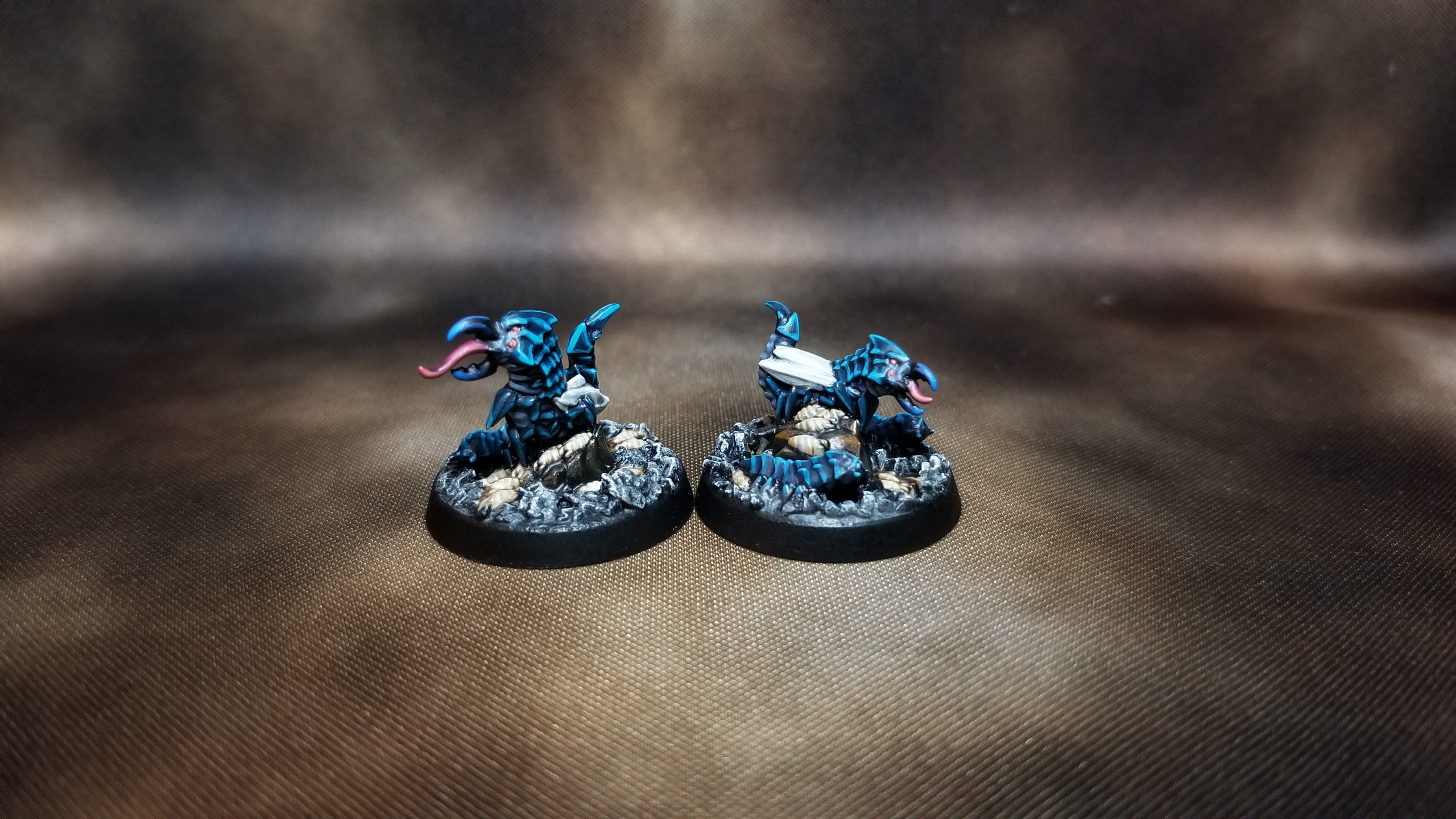 The only other note here is that the carapace on the larger larva received a coat of Snakebite Leather Contrast to show their growth progression between the bright yellow little larva and the larger bugs.