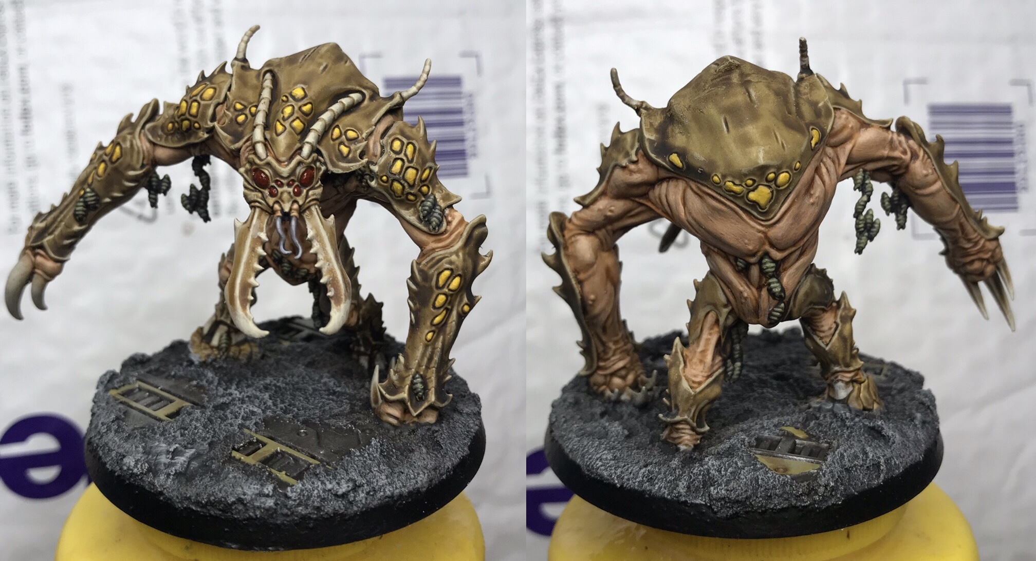 Mandibles and Claws: Based with Rakarth Flesh with a heavy wash of Agrax Earthshade. Drybrushed with Ushabti Bone and highlighted with Screaming Skull.
