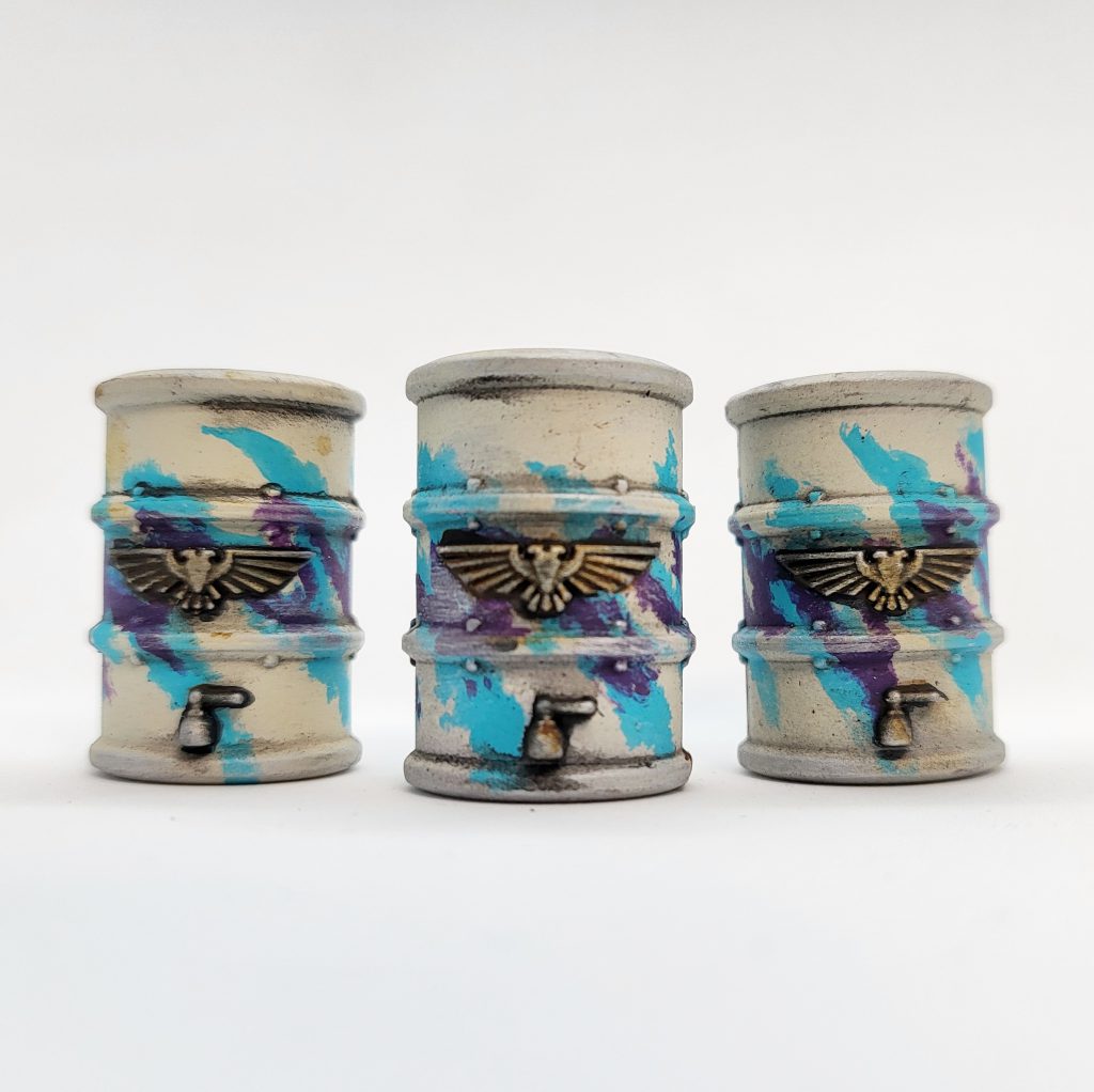 In the grim darkness of the far future, there is only ">A~E~S~T~H~E~T~I~C. Credit: FowlerIf you are doing a giant pile of scatter terrain, you need to shake things up somehow. Try making some of the pieces extra grimy... or slimy, or influenced by the wax paper cups from your childhood doctor's office. If you want to paint Solo Jazz barrels: I recommend a base of a lighter bone color like Vallejo Bonewhite (maybe GW Screaming Skull?), the aforementioned Golden Teal / Temple Guard Blue, and Xereus Purple.