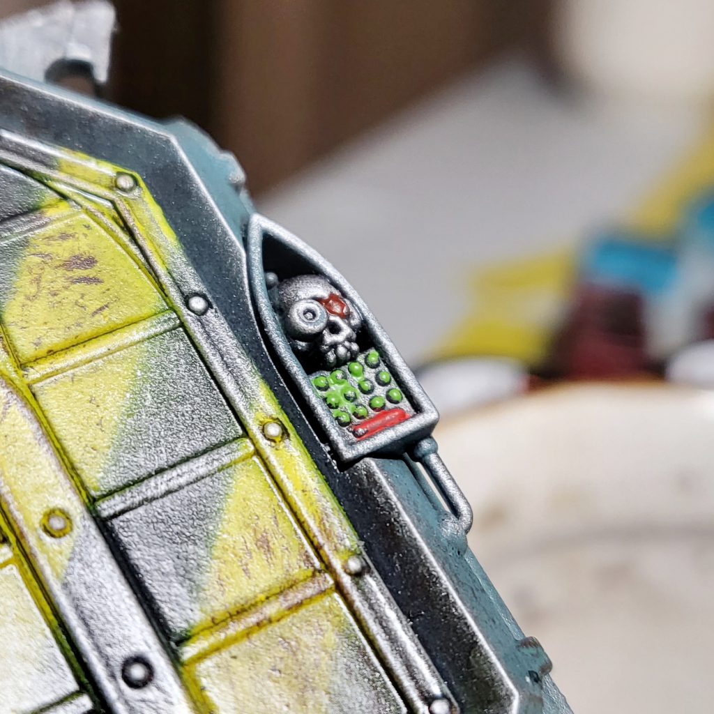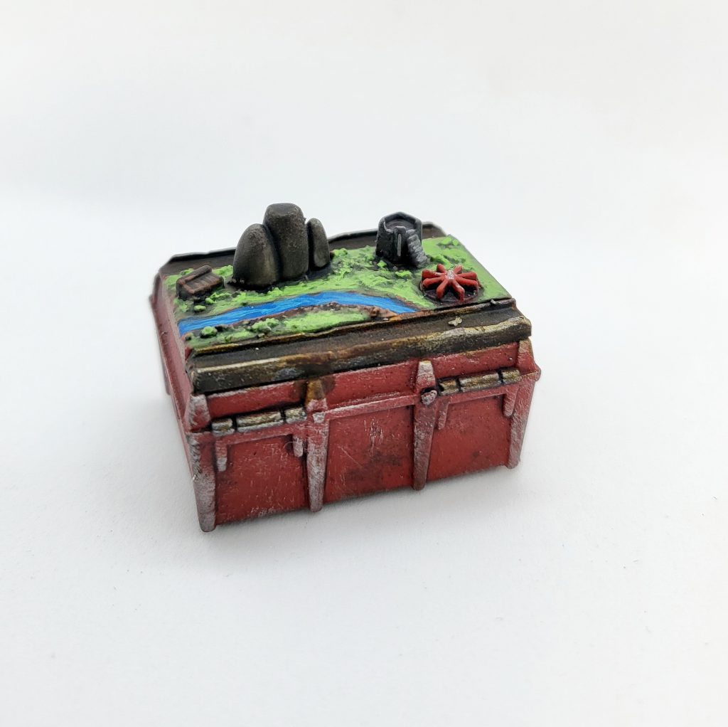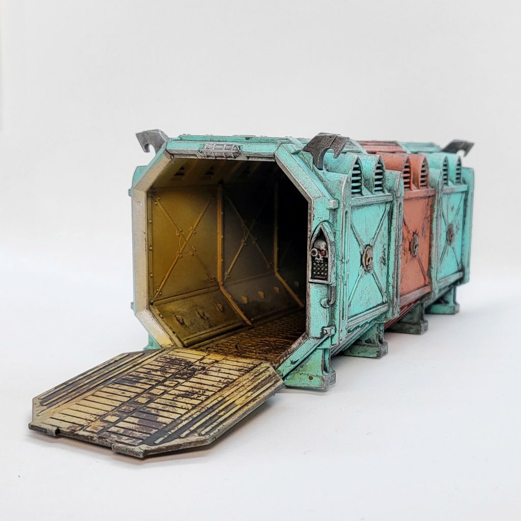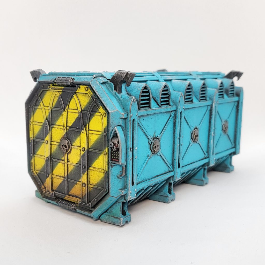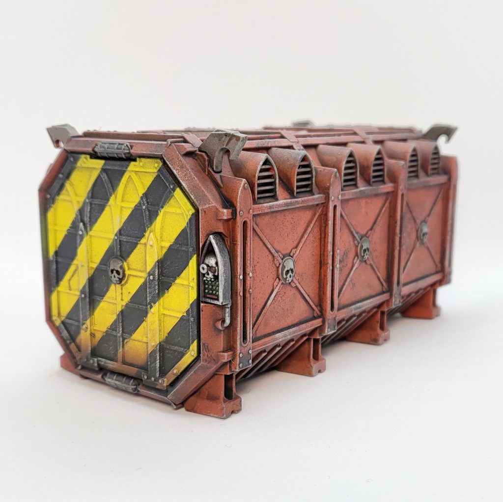 A finished container. You can see the subtle effect the brown drybrush step adds!Next, I used a bit of sponge to dab Stormhost Silver on edges, metals, and in some of the larger flat areas. You can find a great guide to sponge weathering in this 2019 GH article, which is also about painting Munitorum containers!