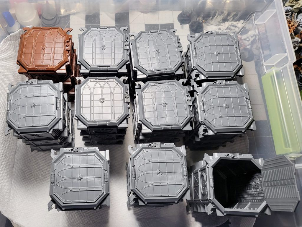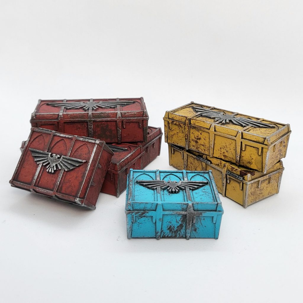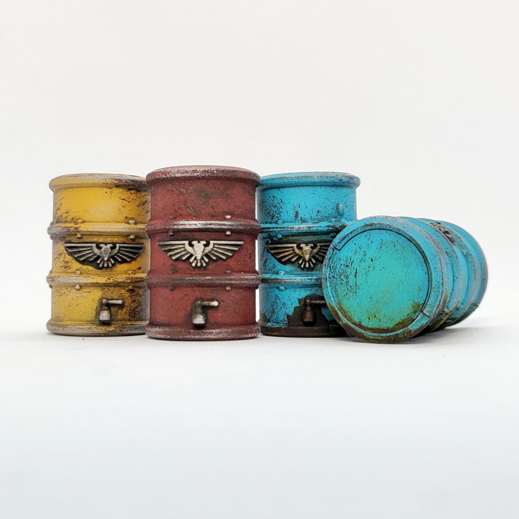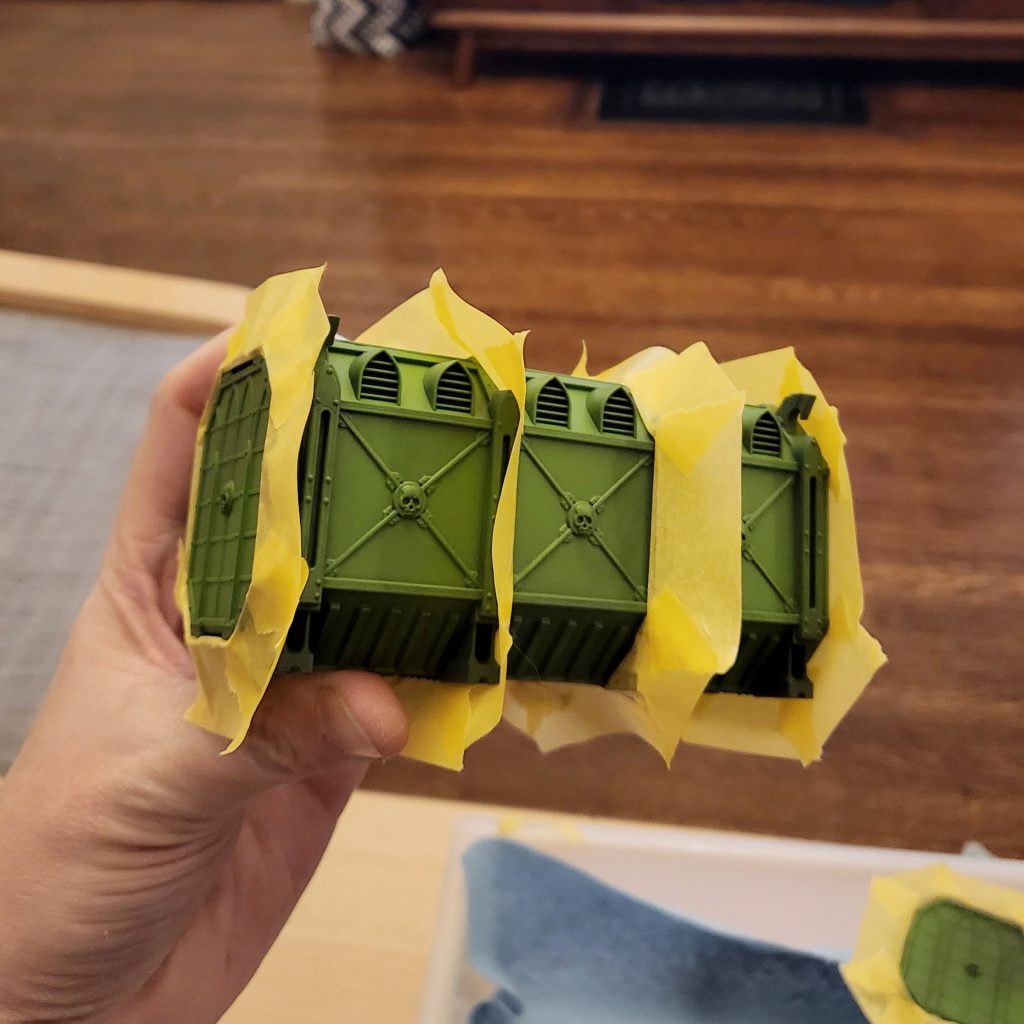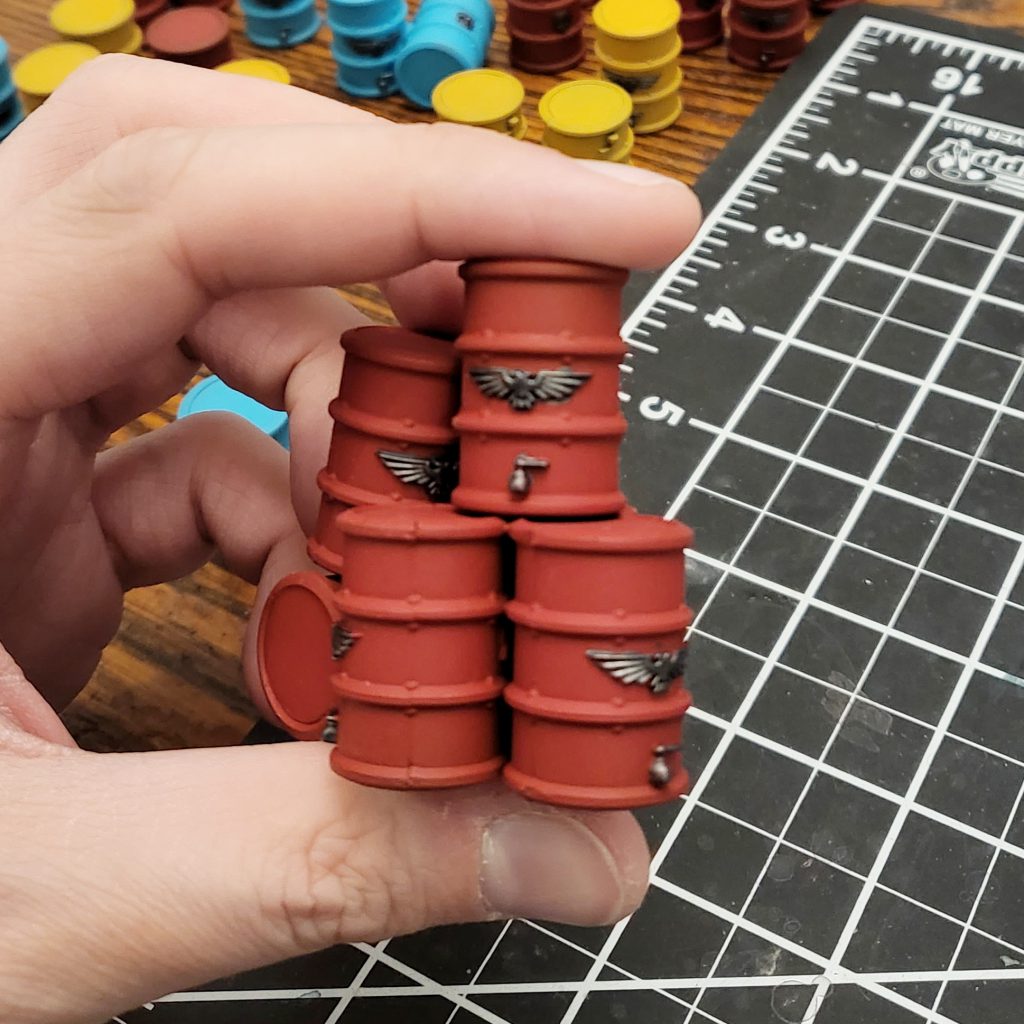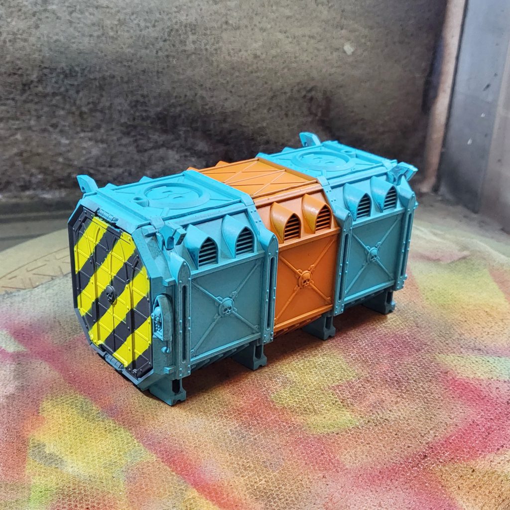 The main 3 colors. Credit: FowlerIn terms of assembly, I followed the Kill Team Arena patterns for most of the barrel and crate piles - though many are still left separate. Two of the containers were assembled with doors open. If I were to do another batch of these, I would leave those doors completely off and glue them on after painting for simplicity's sake.