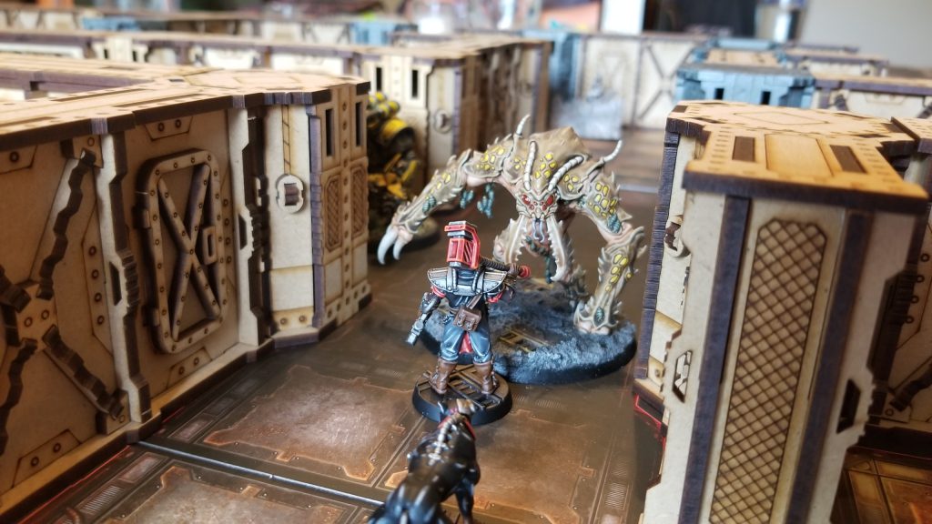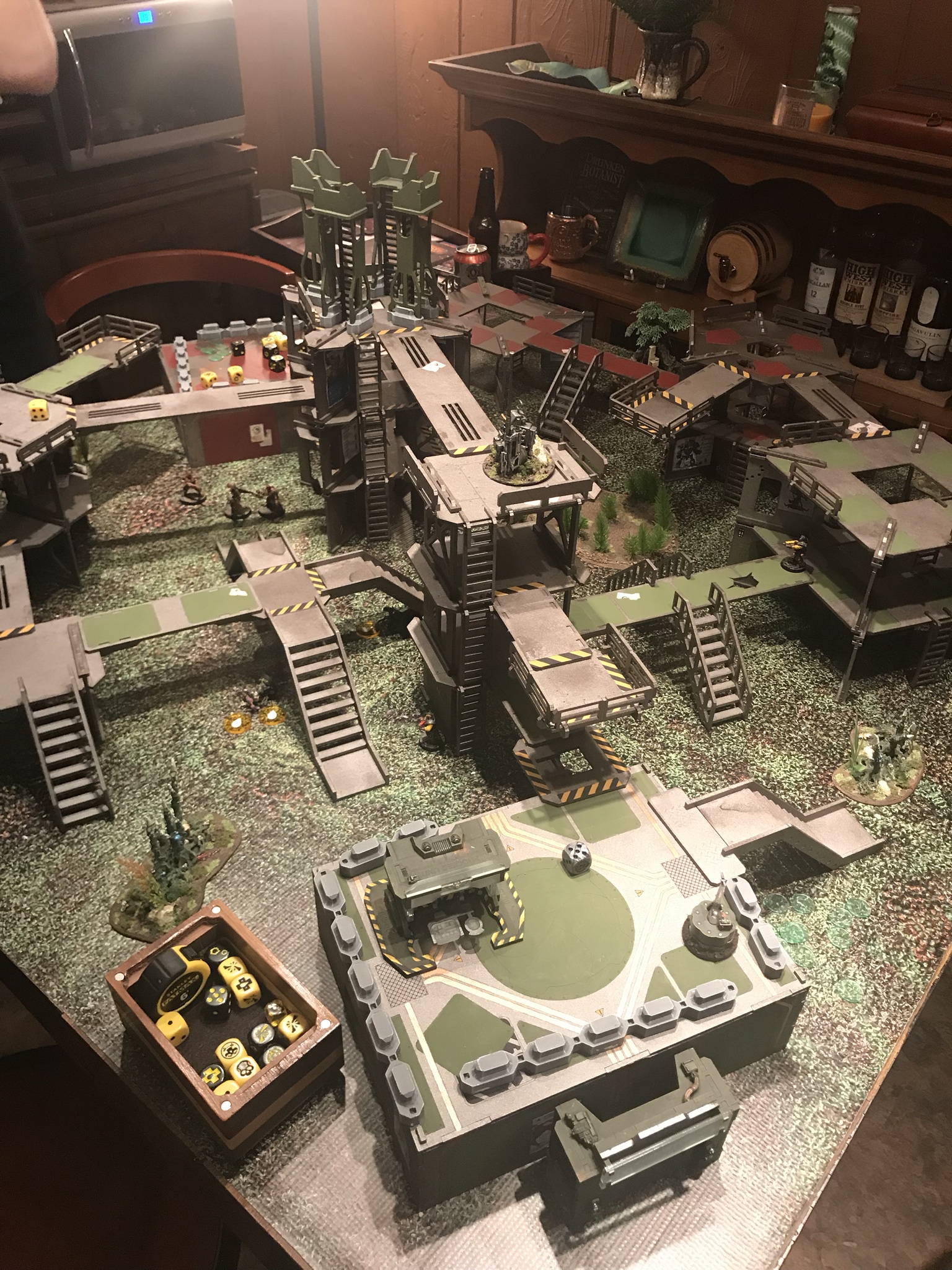 A Zone Mortalis board with Death Ray Designs "Deadbolt's Derelict" walls and columns.If you wound up grabbing the Underhive boxed set along with your two base rulebooks, you already have a Zone Mortalis battlefield ready to go. There’s no climbing or vertical movement on this playfield, designed to evoke the cramped quarters and claustrophobic corridors of the Underhive. You’ll avoid enemy fire by lurking around corners and operating mechanical doors rather than cowering behind rubble. Since line of sight on these boards is limited, gangs with a focus on short-ranged shooting and close combat can expect to have an advantage.