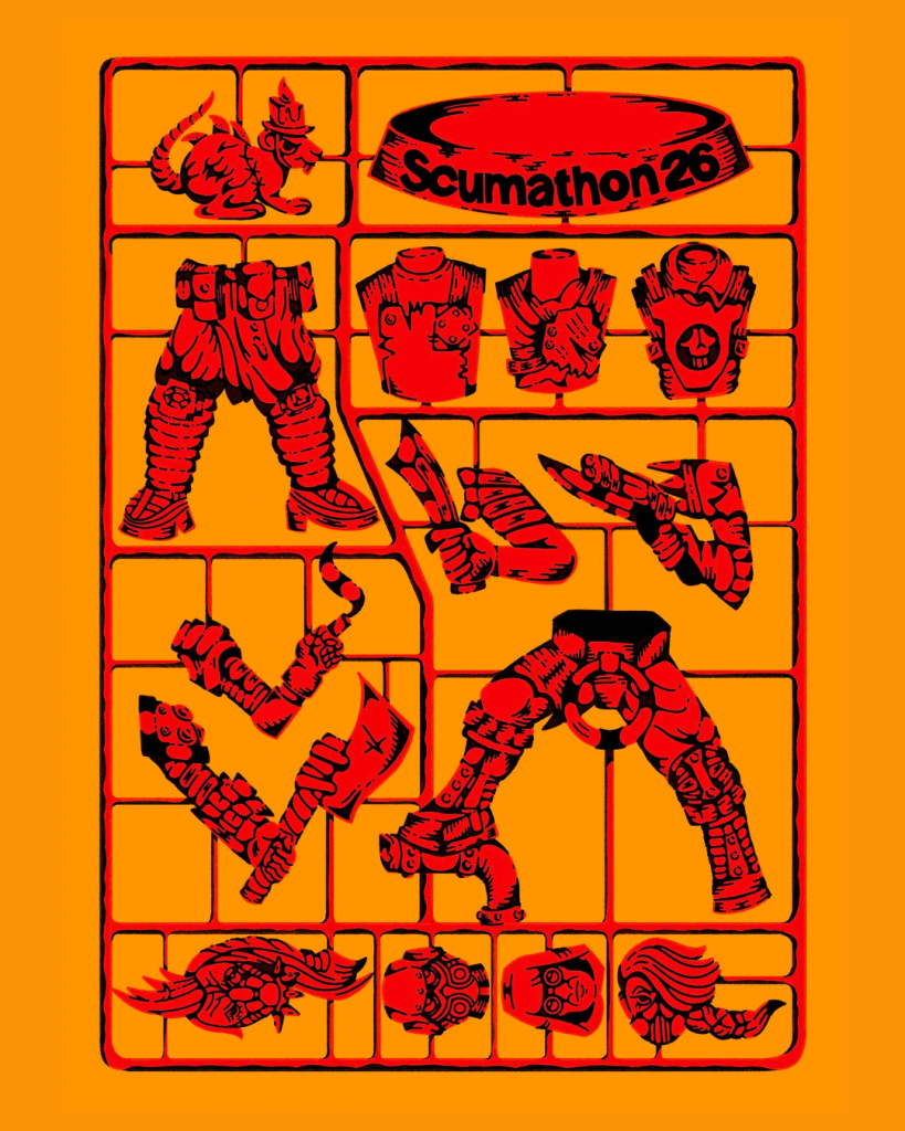 2025 Best in Show Bronze winner. Credit: @hudd.exeFour of our category judges will already be floating around the convention, I'll be present with a pile of bits and some bottles of glue, and infamous goober Erick of @goobinsgitz graciously agreed to help folks "push putty around until it looks good" if they are trying their hand at sculpting on their models for the first time. This will also be your first chance to snag one of the Scumathon26 sticker sheets whipped up by my best pal @girlgremmy, which we designed for you to build your own sticker models with! I'll be sharing more details about this as we get closer to Adepticon on both Instagram and Discord!