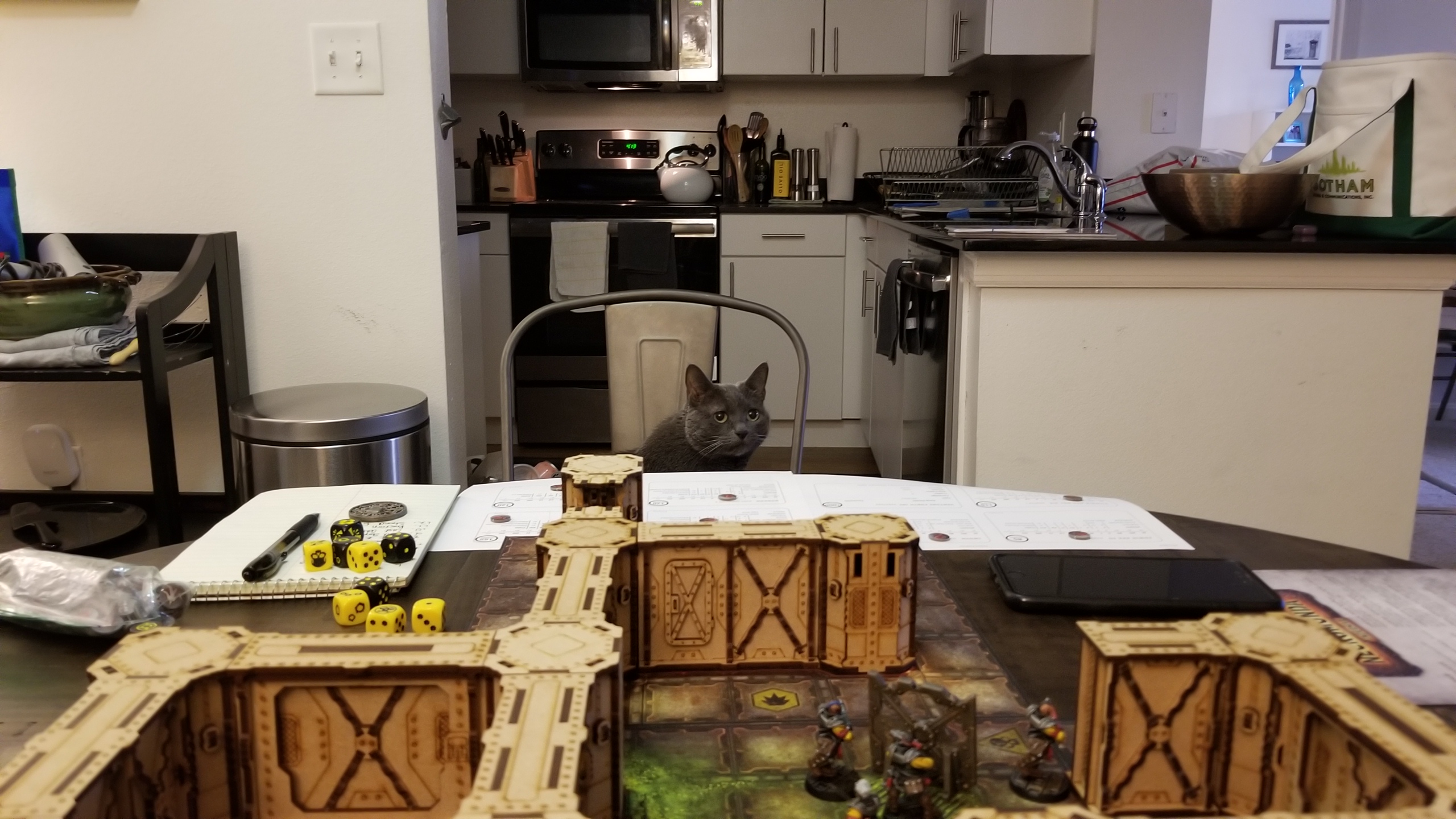 Some players, like this cat, come prepared for a game with fighter cards, dice and notes..
