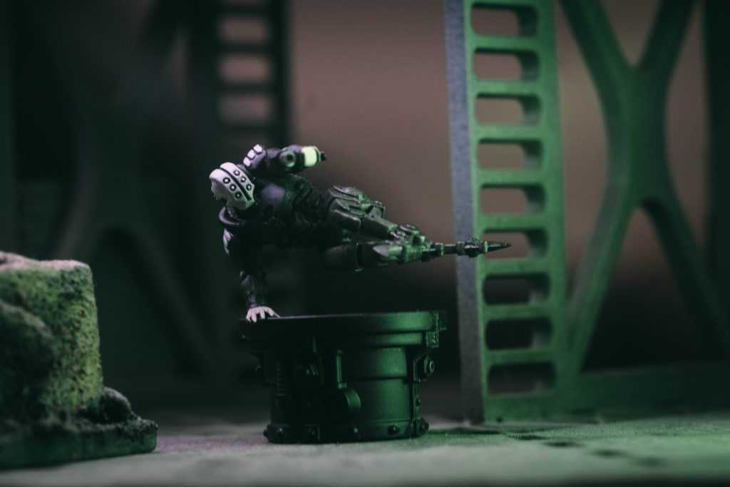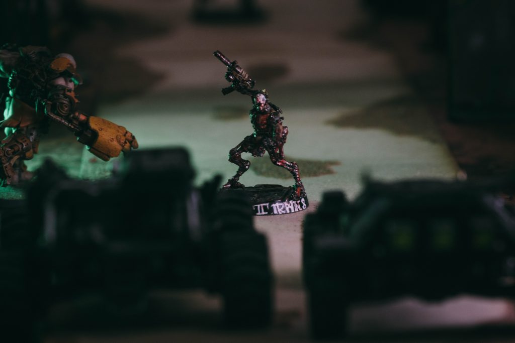 T_ram_builds_and_paints’ murder cyborg in another outing. Photo by Danny Bonnar (@macromunda)Up high, things went a bit better. A game of tactics card trumps went my way, when Dave teleported a Nacht-ghul in front of my gunline only to get caught with Reaction Fire from my Hrud Fusil. Seconds later, the fusilier was brought down — only to have the Murder Cyborg jump out of her skin.