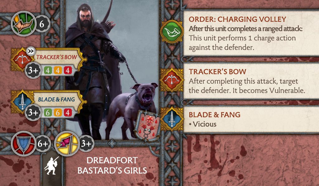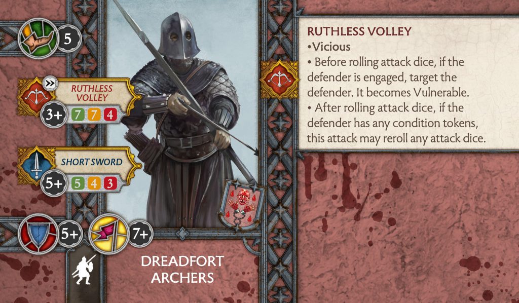 Dreadfort Archers - CMONDreadfort Archers - A pretty big change to the ranged attack of this unit, which is a nerf. Instead of Precision and rerolls when shooting an engaged enemy, as well as ignoring line of sight, you gain Vicious and can put a vulnerable token on the attacker if they are engaged before rolling dice. In addition, after rolling attack dice you may reroll if they have a token on them. The biggest issue here is that without the ignoring of line of sight you are unlikely to generate the token on them, unless you managed to remain 50% aligned with your unit or it's a bigger target like Cavalry which has a slightly bigger tray. You don’t have solos to utilise and so may have to coax the combat into a certain way that plants you in the flank. If they kept the ignore line of sight ability then they would be better than Skyreach Bowmen, which a lot of people say should be nerfed.