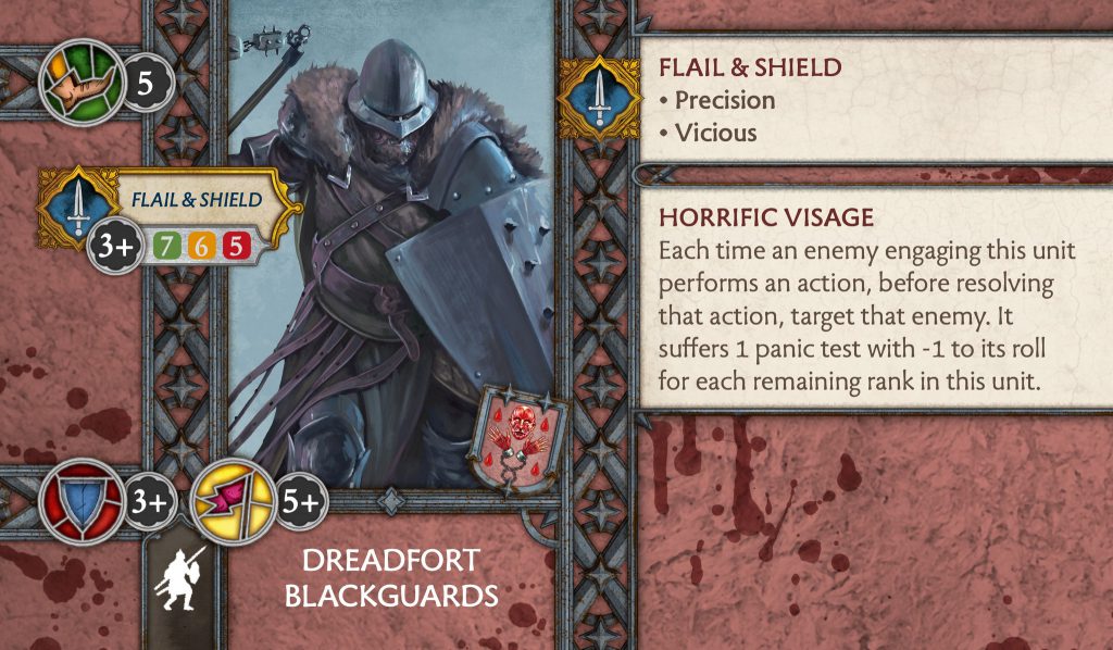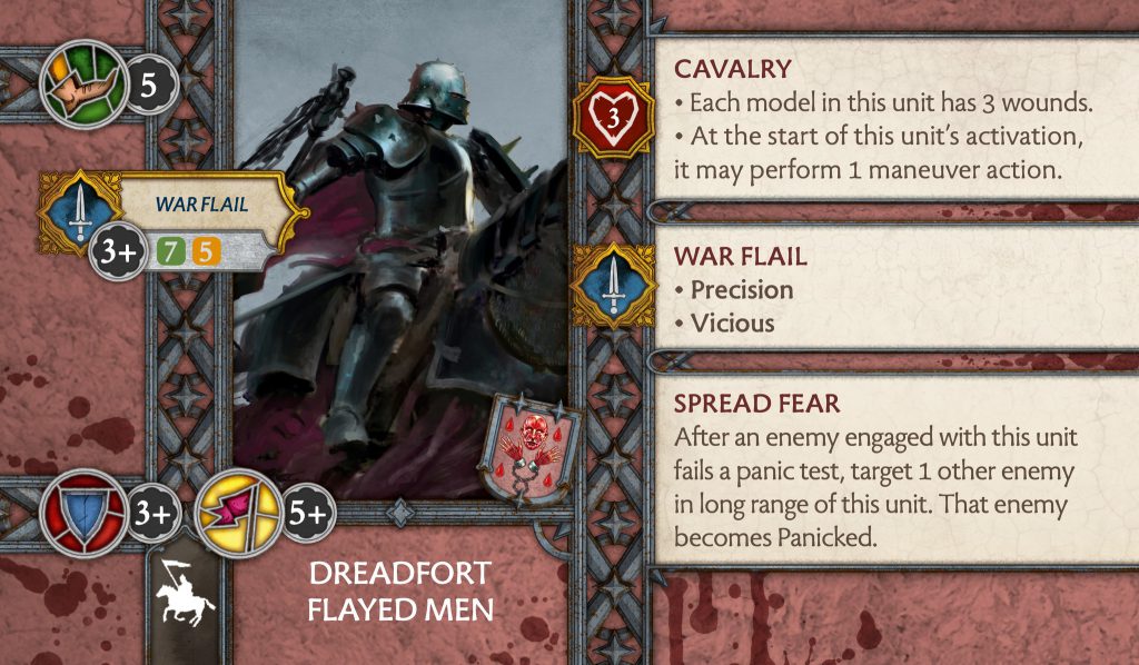 Dreadfort Flayed Men - CMONDreadfort Flayed Men - The unit that has been reworked more times than Carlo has won events. Flayed Men lose their Critical Blow on the charge and the Intimidating Presence ability. Replacing these is Precision, a small increase in morale and full rank attack dice, and the new Spread Fear ability. Spread Fear is no longer an order, so it can happen as many times as the engaged enemy fails a panic test, more opportunities for synergies. However, instead of causing a panic test on another unit that is long ranged with modifiers and extra damage, it now generates panic tokens. It feels a lot more like a nerf than a buff, but you can synergise this a little bit with the army such as Our Blades Are Sharp to gain rerolls and Sundering on the attack. I do wonder if for one point less you bring Hedge Knights though.