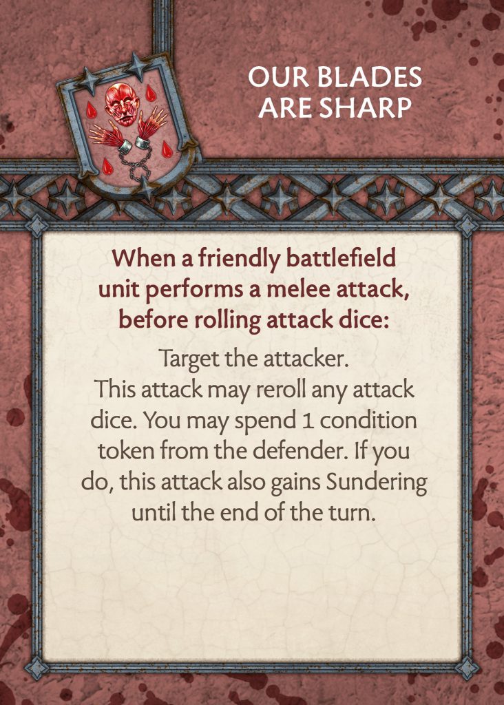 Bolton Tactics Card - CMONOur Blades Are Sharp - Same trigger, so you must be in combat and before rolling dice to use this card. Instead of Precision and then rerolls if your opponent is panicked, you now get rerolls and can spend a condition token to gain Sundering for the turn. It seems like this card merged with Harsh Punishments for the best version of a combat boosting card. It also has a lot of play for almost all units whilst needing any token to get the full effect. A very good rework for the card giving it more opportunities to be played.