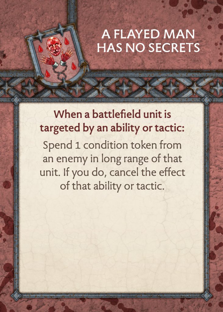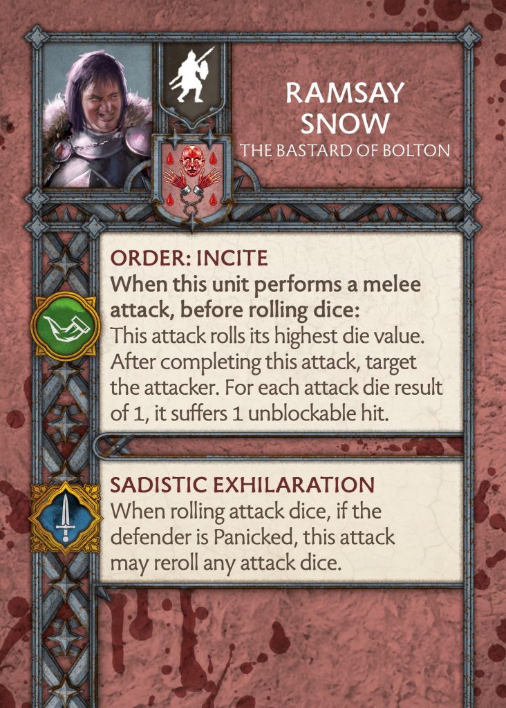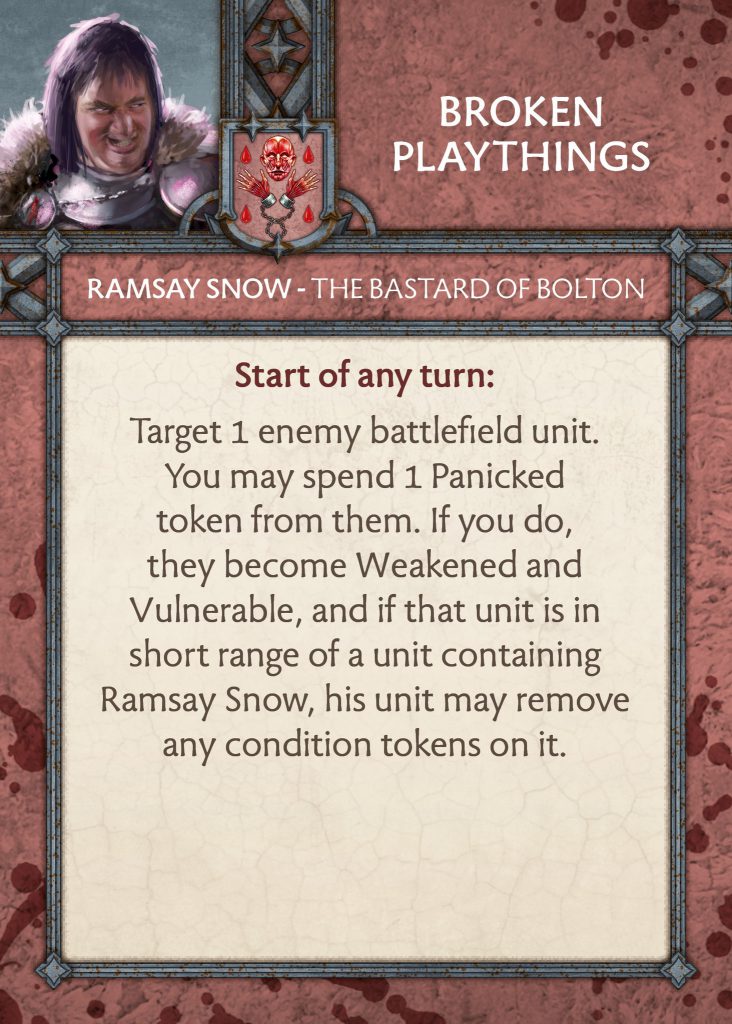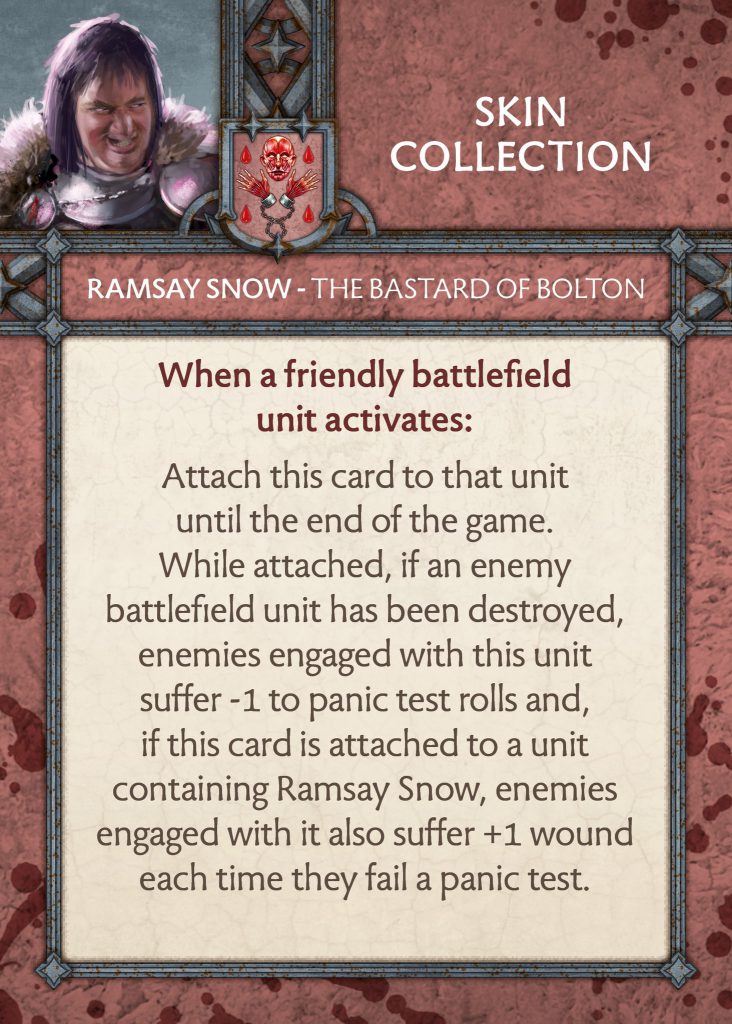Ramsay Snow Commander Card - CMONSkin Collection - The card has had a rework but mostly stays the same. You attach it to a unit, and then once an enemy unit has been destroyed, those engaged with the, suffer -1 to panic tests. This used to be able to go up to -2 if the unit it is attached to had destroyed two ranks but not anymore. Instead, if it is attached to Ramsay’s unit they do +1 additional wound for failed panic tests. So it is Intimidating Presence on a card that activates once an enemy unit is gone. I think this is better overall and makes Ramsay’s unit more threatening whilst slightly buffing another if you get both out. A big positive though is that it is useful at any point in the game as you do not need to hunt for benefits late game.