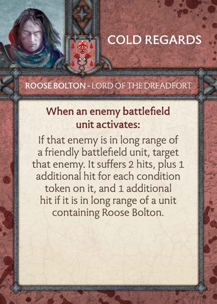 Roose Bolton Commander Card - CMONCold Regards - Seeing Their Flaws is gone and is replaced with Cold Regards. Seeing Their Flaws was always a weird one as you wanted Roose in a good combat unit or even a shooting unit, but his abilities made him belong to the Blackguard which are neither. Some were bringing Steelshanks who counts as Roose for a better opportunity for this card but it was mostly there to generate tokens and move on. Cold Regards change this for some free hits like Hidden Traps but extra hits are generated if you have condition tokens and/or you are near Roose. It is two hits, plus one pre token, plus one if you are in long range of Roose, for a max of 6 hits which is incredible.