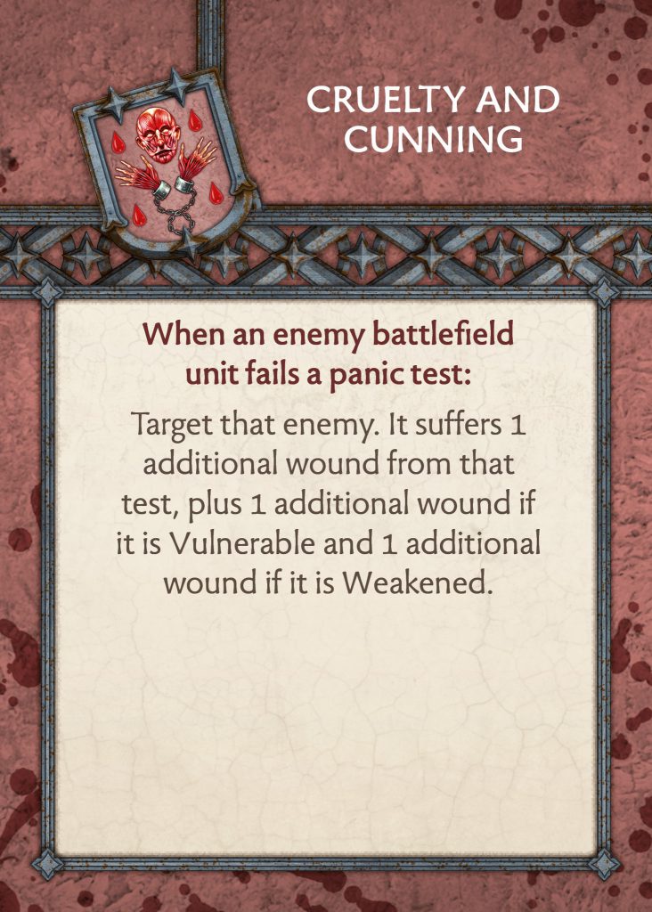 Overall the changes are very good for the faction. More tokens, more opportunities to play, and above all some more ways to synergise your army. Already people are discussing how to do max wounds on a panic test with Cruelty and Cunning, or how to trigger more Spread Fear tests with Horrific Reputation. It is nice to finally see some ways to build strategies in the army rather than just adding buffs to some failed morales. This is a stronger base deck for the force and should give them some extra bite against the rest of the game.