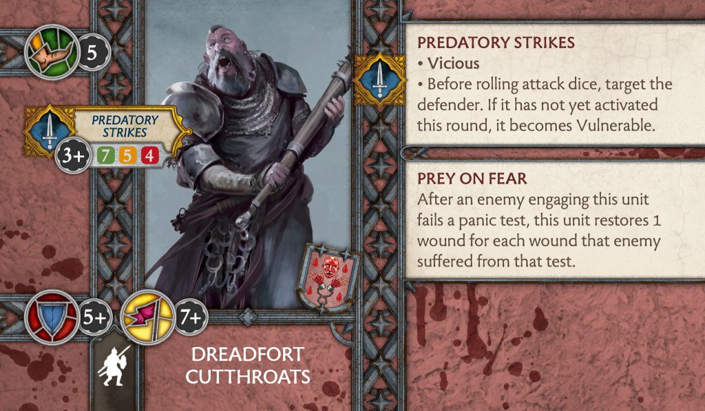 Dreadfort Cutthroats - CMONDreadfort Cutthroats - Small nerf to this unit; however, it was and still is a strong 5pts unit. The big impact would be if it also changes for Neutrals as it was a 5pts option that a lot of people across many factions would consider. The midrank loses a dice going to 5 dice, and you no longer gain rerolls for your melee attack if the opponent hasn’t activated. You do now get Prey On Fear which has changed for the better. Instead of healing two wounds from a failed panic test you heal the same amount that was dealt. So with some synergies from abilities and tactics cards, this could be a large amount. You get out what you put in with this unit.