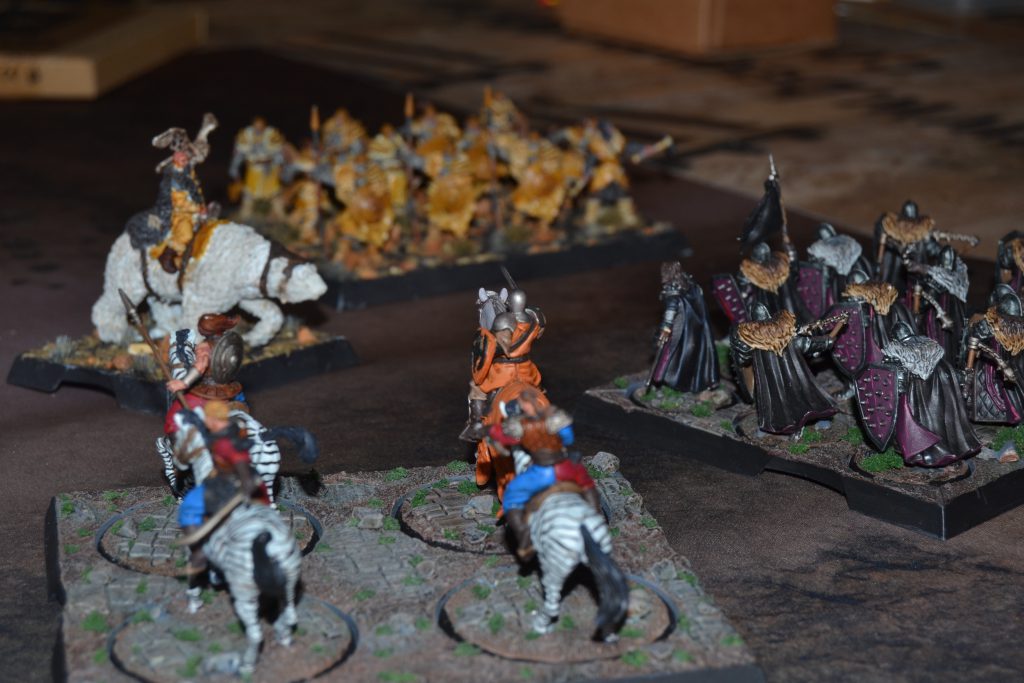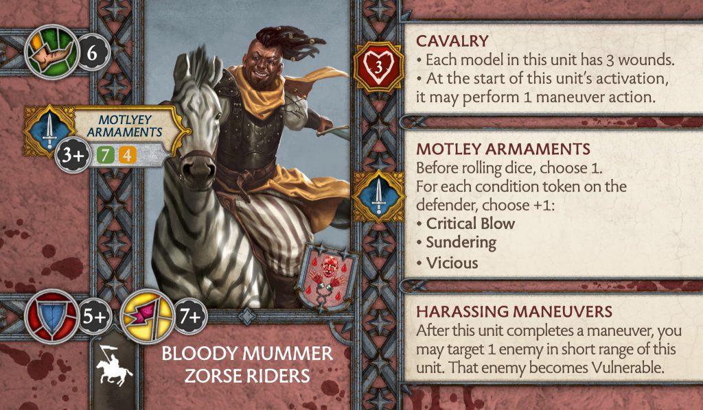 Bloody Mummer Zorse Riders - CMONBloody Mummer Zorse Riders - Zorse Riders are really strong at the moment for their fast movement, and their glass cannon attack that removes abilities and can be quite devastating in the flank or rear. They have changed a lot with how you may use them now, I am not sure for the better since they were a good utility piece before to get around defensive capabilities which is now passed on to the slower less deadly Skirmishers. Their full rank attack dice went up by one, Motley Armaments changed to gaining a keyword plus an additional keyword for each condition token on the enemy unit (Critical Blow, Sundering, Vicious), and they lost Elusive Escape for Harassing Maneuvers which generates a vulnerable token in short range after completing a maneuver. They keep the general theme of being fast, easy to kill, and hit hard. It is just a shame we lose the remove abilities that made them so unique.