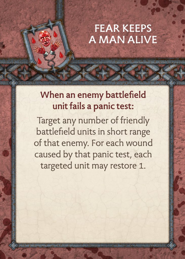 Bolton Tactics Card - CMONFear Keeps A Man Alive - Some small changes here. The range of the heal is now short range instead of long range, so you want to play your forces together to get the most out of this otherwise the unit that did the panic test is getting the heal. One nice thing is that you get an extra wound on the heal if your Commander is nearby. It is always nice to have a heal in your deck and there should be plenty of opportunities to use it since most units have Vicious in Boltons. The range change is likely there to keep the power of the card under control since some factions have healing cards that define the whole game.