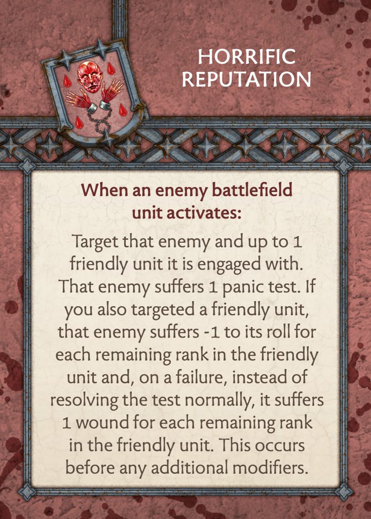 Bolton Tactics Card - CMONHorrific Reputation - This card is wordy and difficult to understand off the rip. I had to read it a few times, and I imagine many opponents will need to do the same when they see it being played. Essentially, it makes an enemy unit suffer a panic test when it activates. But if it is engaged with a friendly unit, it suffers it at -1 per rank in the friendly unit and instead of rolling dice it is a wound for each remaining rank. You can for sure clean up this card to make it easier to understand. But for the most part, it is Spread Fear/Horrific Visage in a less restrictive situation.