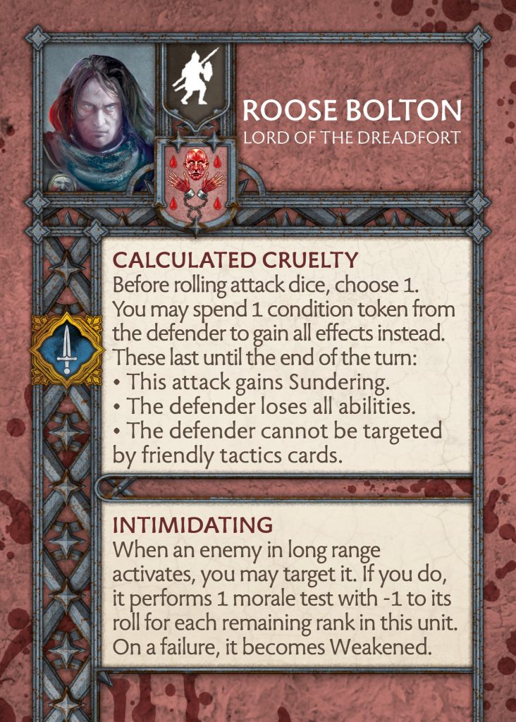 Roose Bolton - CMONRoose Bolton - Roose has always been a control Commander and the changes keep this theme running. He has had a complete rework to make him more unique since he was just a Bolton Flayer and Dreadfort Captain combined. He now has Calculated Cruelty which allows you to spend condition tokens on the defender when making a melee attack for some benefits such as Sundering, stripping abilities, or preventing the opponent from using tactics cards. All of this is a very powerful ability for combat.