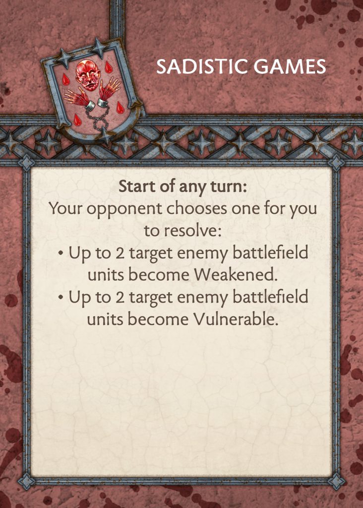One of the main problems with the Bolton force was their tactics deck being limited. You had to be engaged or force your opponent to fail panic tests before you could use some of your cards, which might not even be useful at that moment. You would then be stuck not being able to move through your tactics deck for benefits in the game. Baratheons had the same issue a few seasons ago where they couldn’t utilise their deck, as you couldn’t trigger the cards.CMON have recognised this and completely changed the faction design from a focus on panic tests to a focus on condition tokens, which will be a powerful change for them. Harsh Punishments, Cruel Methods and Bloody Beheadings are gone, while the rest have been reworked.