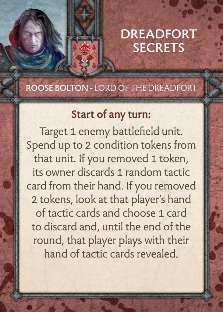 Roose Bolton Commander Card - CMONDreadfort Secrets - This card used to be about making units panicked and could only be used when an enemy rank was destroyed. Now it is all about messing with the opponents tactics hand by spending tokens for effects. If you spent one the opponent discards a card at random, if you spent two from the same unit then you look at the hand and choose the card to discard, plus they play the rest of the round with their cards revealed. This is an incredibly powerful card and is the first one in the game that keeps the opponent's hand revealed to you. It is a really cool thematic card and gives you the knowledge to play around what your opponent is thinking up.