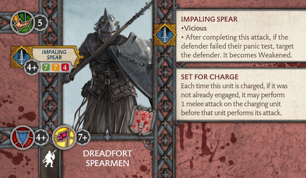 Dreadfort Spearmen - CMONDreadfort Spearmen - This was a unit that was not that great and did not see a lot of play outside of a specific combination. Whilst Impaling Spear was creatively excellent it was just not performing and the unit suffered from this by being relegated to the dusty shelves. Two things changed with this unit. A universal change to Set For Charge which no longer has it as an order but a constant ability, in addition you can now trigger it in the rear. At first glance this doesn’t make sense since all the models point their spears forward, but it could represent times when spearmen make a circle of spears to ward off cavalry charges. It is a good change that negates a negative part of the rule that almost never happened anyways.