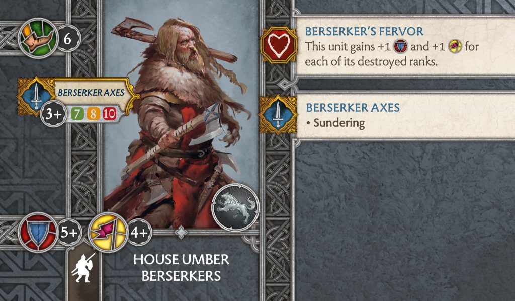 Umber Berserkers saw their final rank go from 9 dice to 10 dice and gained Sundering for their melee attacks. There are also some nice wording changes on Berserker’s Fervor to add in symbols for an easier understanding. Furthermore, the morale stat went up by one and is now a 4+.Umber Berserkers have a unique playstyle where you want to play them on a knife’s edge. Keeping them as injured as possible without losing them rewards you with a powerful unit on the tabletop; however, it is how powerful they become which is a point of concern. There is no unit in the game as strong and survivable as Berserkers on their final rank, and it will take more resources from your opponent to shut them down then it takes for the Stark player to use the Berserkers.