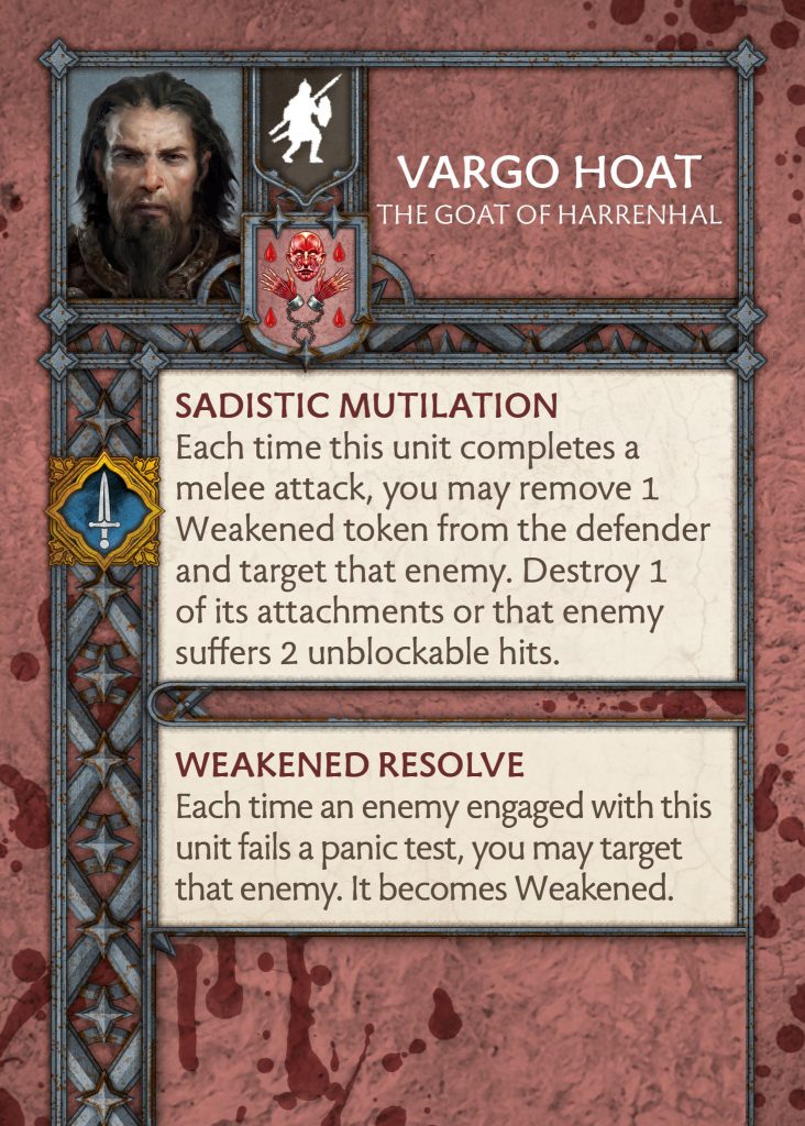 Vargo Hoat - CMONVargo Hoat - We do not know if this is a Commander Vargo or an attachment Vargo, and we have not seen any Bolton tactics cards for him. It seems more like his attachment version since it is mostly the same. Vargo lost Vicious, and both Weakened Resolve and Sadistic Mutilation saw some changes. Weakened Resolve had some wording changes to help know what is targeted but remains the same. Sadistic Mutilation has the same wording changes to include some targeting clean up, whilst also offering two unblockable hits instead of killing an attachment. So if there is no attachment or you don’t care for it, do two unblockable hits.