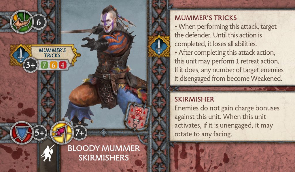 Bloody Mummer Skirmishers - CMONBloody Mummer Skirmishers - A huge rework for this unit, they lost all three of their abilities and lost a dice on the final rank. In return, they gained the Skirmisher ability which prevents any charge bonuses like rerolls, and if they are unengaged when they activate they can rotate any facing (weird wording there). Their melee attack now strips the opponent of their abilities, and after attacking it can make a retreat resulting in all enemies engaged becoming weakened. When using this unit their defensive abilities never shone enough to keep them alive and balance out their terrible defensive stats, the changes may actually do enough to keep them around whilst they dish out some damage. The attack is nothing crazy but removing abilities is very strong, I would be looking for an attachment that boosts their melee attack. These changes will see the unit being played more.