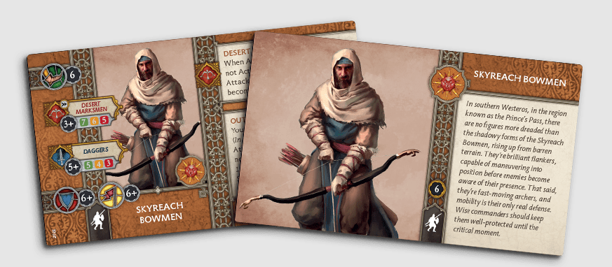 Skyreach Bowmen Models - CMONMy favourite Commander is Daemon Sand who loves the new Bowmen. His card, A Need For Vengeance, allows a free attack at the start of a round, which can pair well with the Bowmen who want to attack a Unit before it has activated. However, I don’t see any of their rules being synergistic with other Commanders. They are a Long-Ranged Unit that gives a Martell player pressure at Long Range instead of getting close with Skirmishers. They’re a great addition that I doubt will be a problem, but things can always be different on the table as opposed to reading stats off paper.