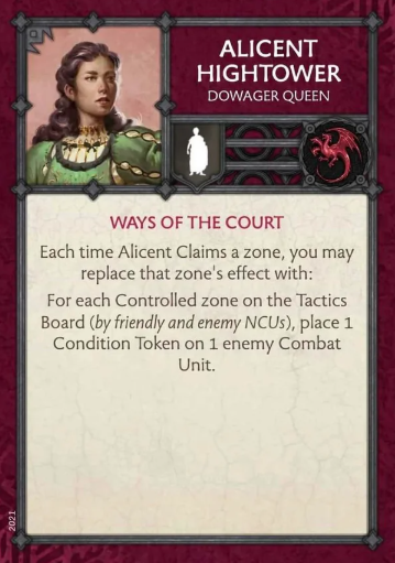 Alicent Hightower Rules - CMONAlicent Hightower can replace a Tactics Zone’s effect with placing a condition token out on an enemy Unit, but you can do this per zones controlled by both players. If she is the fifth NCU to activate and take a zone, then this would generate five conditions tokens. This is an incredibly powerful ability that should result in her being an expensive NCU since the best in the game can only do three condition tokens with some caveats of once per game. She can do it every turn, for 4pts. This is incredibly broken, there is no reason for a Targaryen player to ever leave home without her. I would recommend changing her points to represent the rule but at 6pts this could still be very usable. The rule itself needs changing to reduce the number of tokens, either remove the opponents controlling NCUs that add towards the effect, or max it out at three tokens. No matter what the developers do this needs to change.