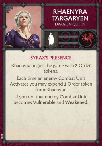 Rheanyra Targaryen Rules - CMONRhaenyra Targaryen can twice per game hand out a Weakened and Vulnerable token to an enemy Unit when it activates for 4pts. Targaryen’s don’t have a lot of ways to generate tokens so this is a strong addition to their NCU roster, the added bonus is using it when an enemy activates which would be a defensive boon to your force to get a Weakened token out that is unlikely to be removed before it can be useable. Rhaenyra is strong but completely fine for the game and helps boost the already strong Targaryen Faction when combined with Mother of Dragons.