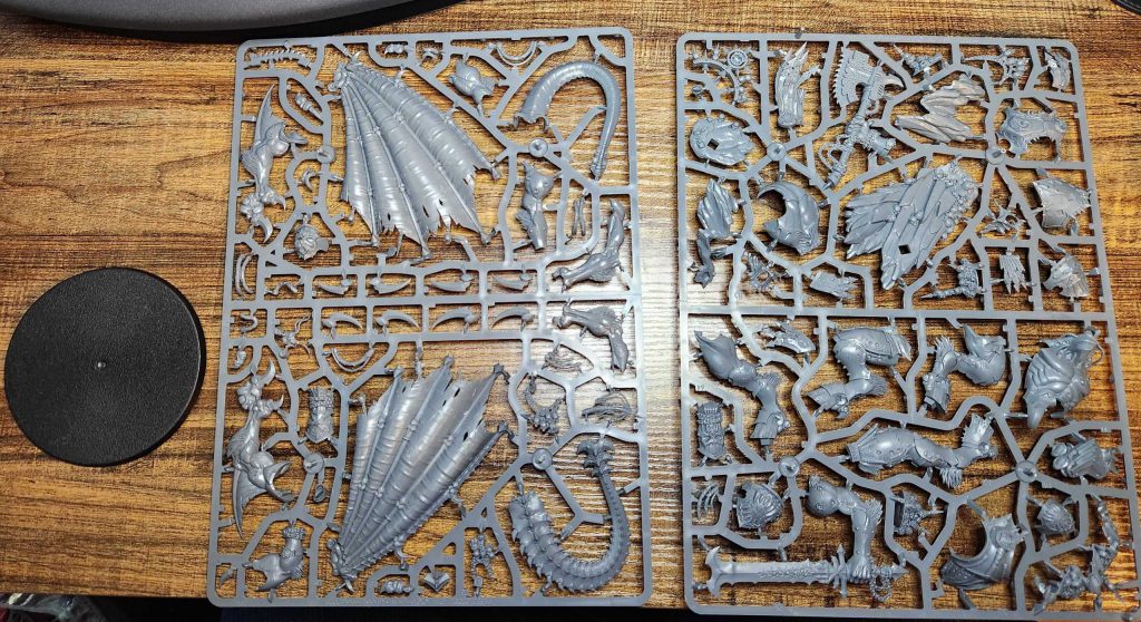Let's start with the Primarch. Angron is the third Daemon Primarch to get a model, and he's got just about as much mass as Mortarion or Magnus, but in a more compact package and with fewer spindly bits. Angron comes on two large sprues with a large round base, sized the same as the one you'll get with Mortarion or Magnus. In terms of options there's really just one here - he comes with an alternate "closed jaw" option you can put on him. Really, the options here are to just leave parts of Angron on the sprue, which we'll talk about in a moment.