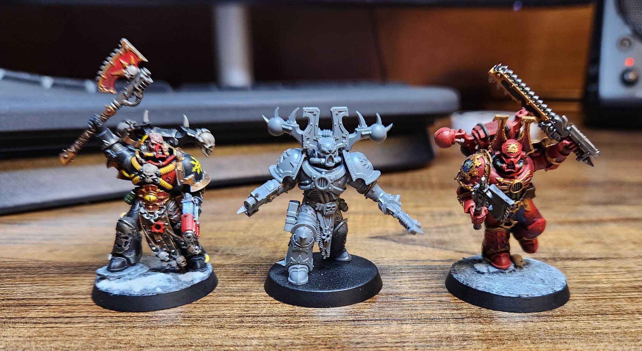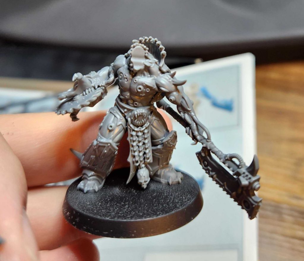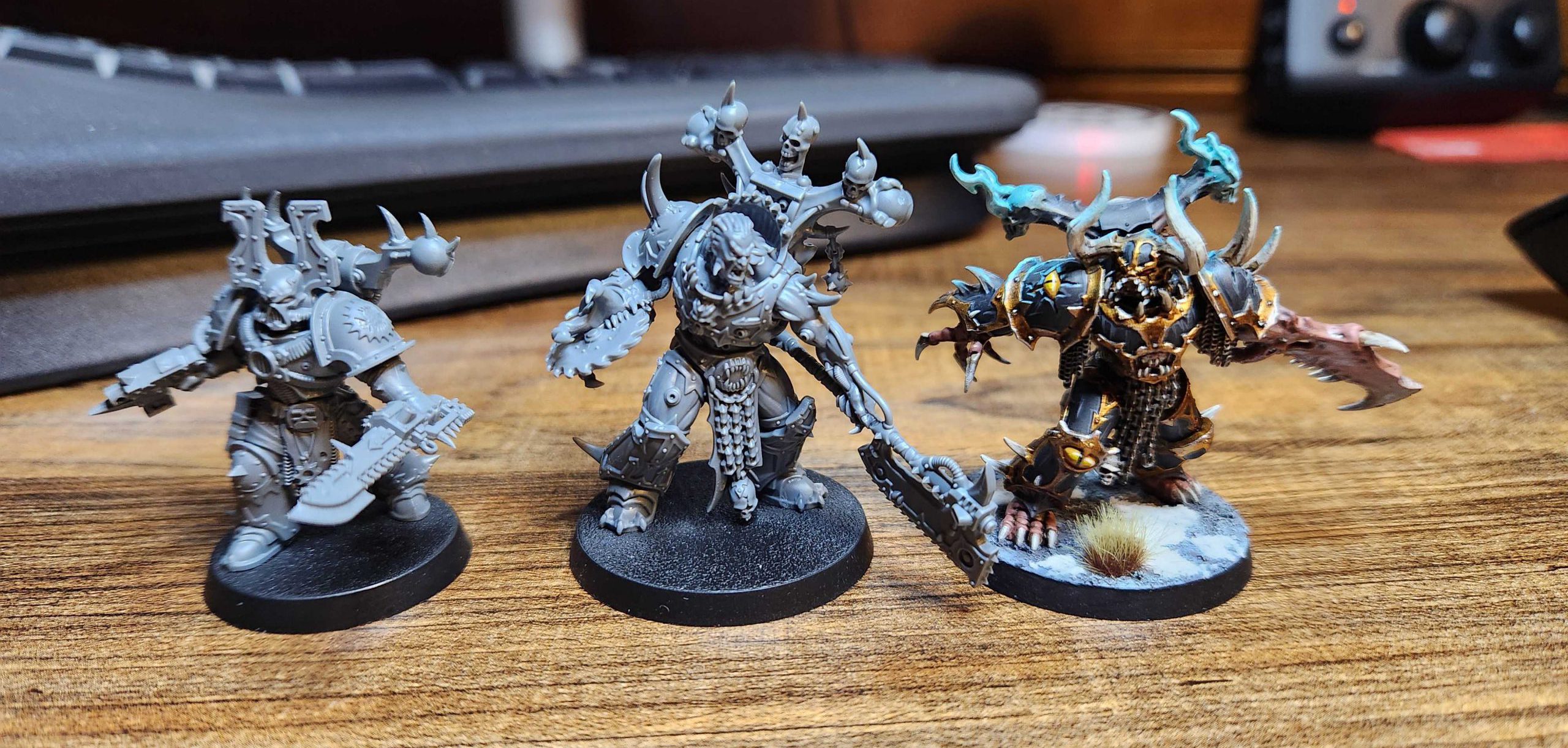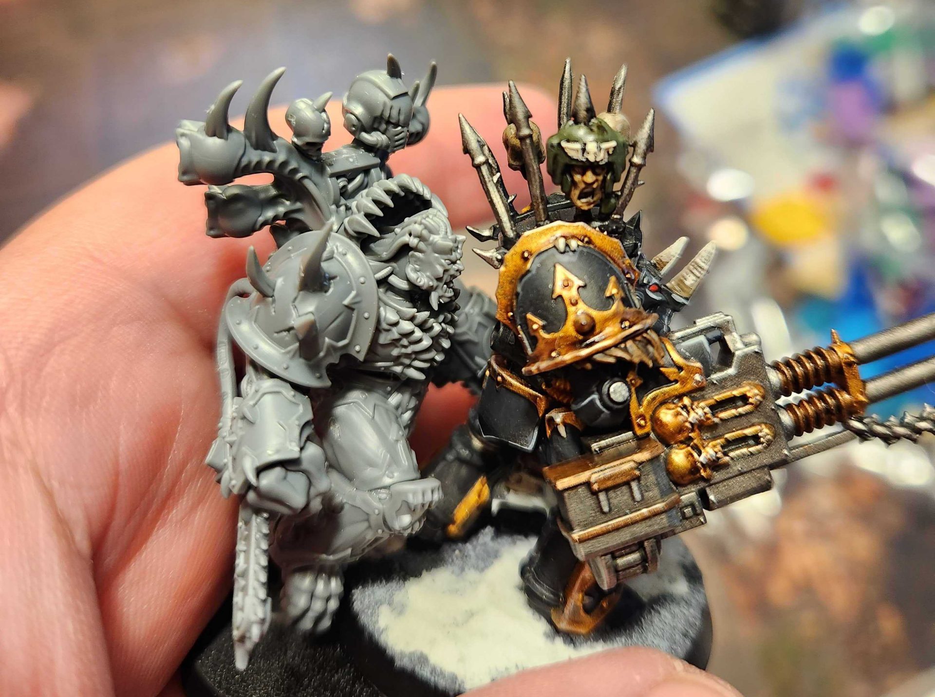 you vs the guy she told you not to worry aboutOne of the coolest things about this kit is that Invocatus and the Chaos Lord are completely separate models - they share zero components, so you will always have an extra model to work with if you build this kit. That means that if you want to build both you can avoid buying a second Invocatus by mounting your Chaos Lord on a Bloodcrusher Juggernaut - you can pretty easily make the head and collar fit without much cutting and modifying, but the legs won't fit the Bloodcrusher Juggernauts. On the whole this is a teeny bit smaller than it would have been using the standard kit, but note that the Juggalord sits a tiny bit lower than Invocatus. The Juggalord comes with two pairs of arms, so you can give him either a chainaxe or a chainsword on one side and a plasma pistol or having him holding the Juggernaut's ring on the other. Neither makes a difference rules-wise.