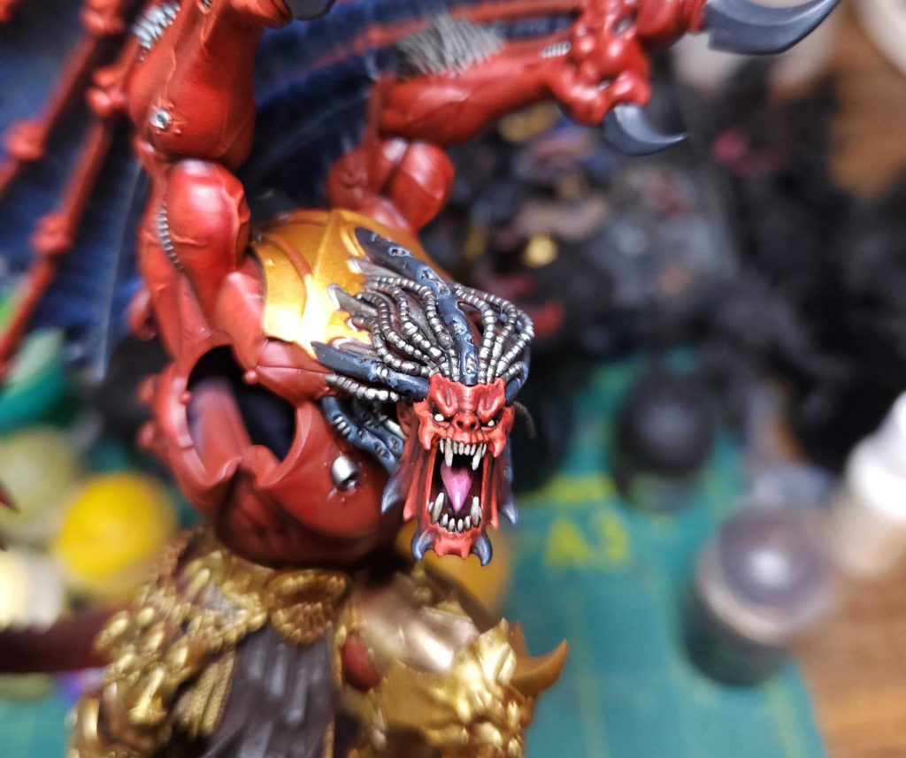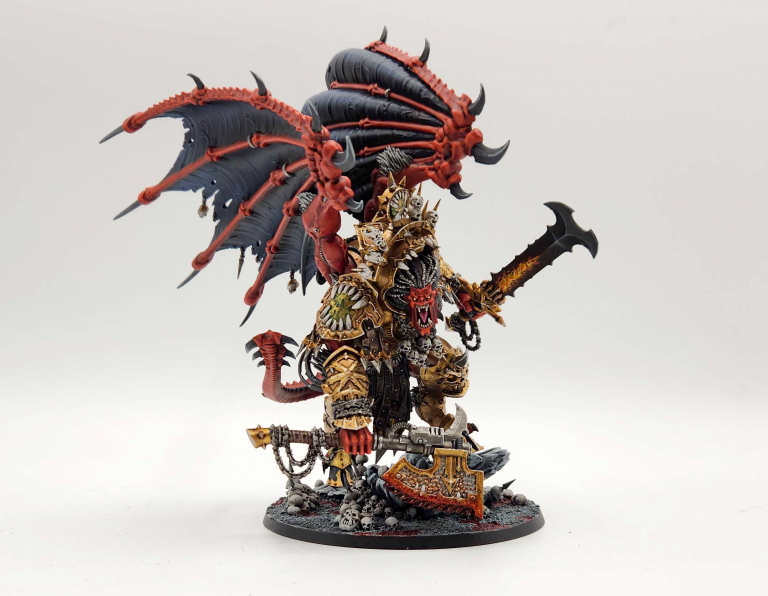 Size-wise, Angron is a little bit more compact than Magnus or Mortarion, and as a result likely to be quite a bit easier to hide on some tables. While he's just as big a pain in the ass to transport from a width standpoint, he's got a bit more compact profile since his wings aren't flared out dramatically.