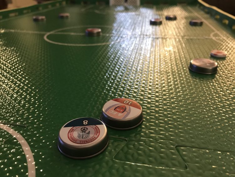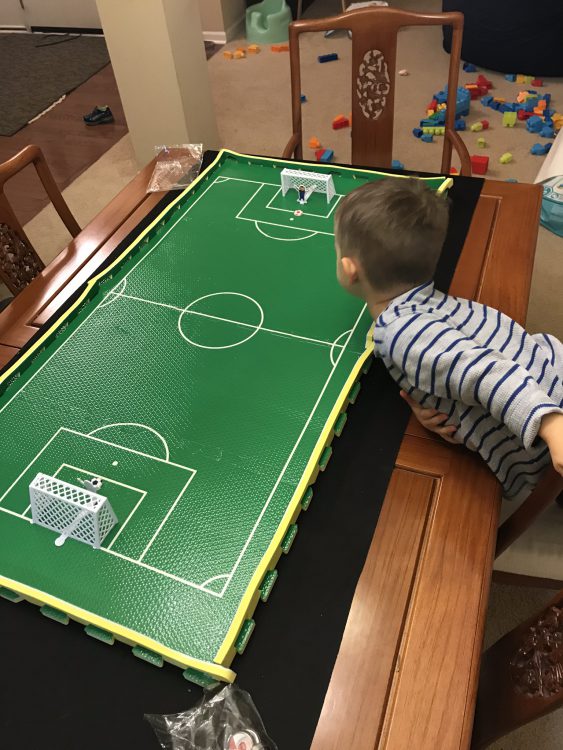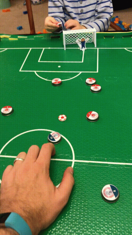 3 year old child for scale. Credit: Raf CorderoThe soccer pitch is made up of 4 large foam rectangles that fit together like puzzle pieces. The top surface itself is made of a slick plastic coating that allows for the actual playing pieces to zip around the pitch. Goals and goalies are plastic, and additional foam barriers slit in around the edges of the pitch to keep pieces from sliding off. The player pieces look like metal bottle caps that don't have the serrated "crown"; they're thicker and heavier than bottle caps but that's the easiest way to describe them. It also comes with stickers so that you can represent your favorite team; I chose the Arsenal look-alike for one team in an effort to keep marital peace and a Nigerian team for the other.