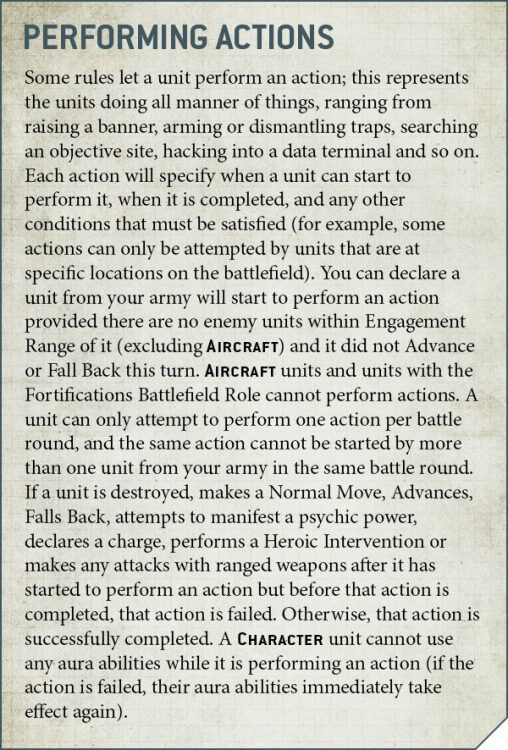 Yes, it's actually Actions, but we liked Activities more. Credit: Warhammer CommunityPretty big change, this. If you're familiar with any video game that involves capturing points, or the ITC 2020 mission pack and their "Saboteurs" secondary objective, this is a new take on that. Essentially, a unit takes a break from war, to accomplish some other action that gets you VPs. There's a lot to digest here, and they've only given us one example of what an Activity is, which we'll cover in a second, but here's to hoping that "drifting go karts around Moon Base Klaisus" is on the list. If nothing else, it's novel to add a fourth mechanic to the usual list of "move, shoot, punch" actions that a unit can take. Particularly rough chuckle here that it turns off auras, adding a note of tactical choice/desperation to having your Chapter Master do their own dirty work. We cover an important change to Aura abilities below, that we have to assume was absolutely made with this mechanic in mind.