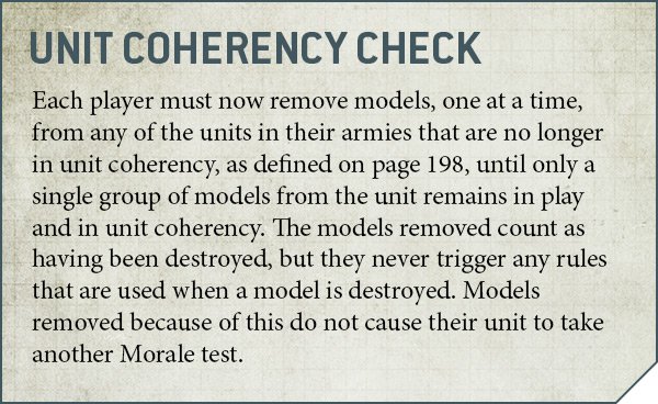 Credit: Warhammer CommunityThat's right, in a validation of the fear that grips every dog-owner when their pet wanders off at the park, you don't get to just hang around and move into coherency whenever you get around to it, your models straight up die. Turning back to our conga-line example, this would roll up the line and result in the entire unit disappearing as soon as the first model on the end is removed. That is, if you're forced to remove the first model as a casualty, then the second is no longer in range of two, so they disappear during the coherency check. But that means the next model is no longer in range of two, so you remove that one, which means the third model... and so on down the line until you're under 6 models in the unit and the rule no longer applies. We're expecting either an FAQ or to have to write a Ruleshammer about this one just to really drive the point home, because that is hilariously punishing.