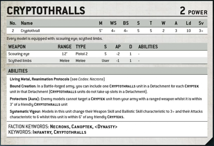The 'thralls have their own attacks, which actually aren't even bad, but their Protectors aura (and thank god that GW is explicitly tagging aura powers now, with the proliferation of abilities [edit: or Activities, apparently] that turn them off, the clarity is appreciated) is an upgrade to the character targeting rules, making friendly nearby Crypteks straight up untargetable, which instantly makes them worth using. What's 2PL (probably around 40 points) compared to avoiding every argument about character targeting and carefully managing model placement.