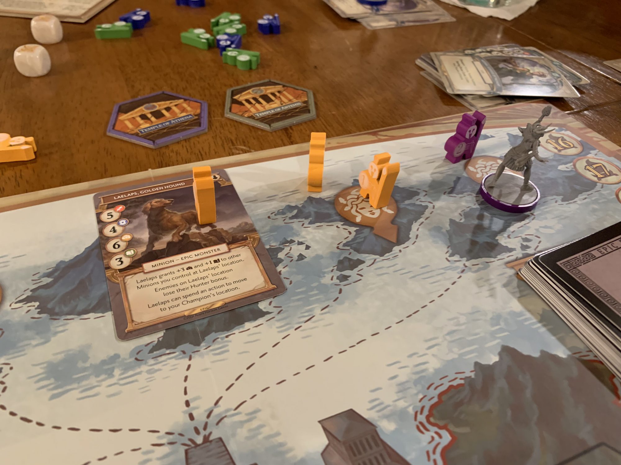 Unfortunately, a broad cast of characters comes with its own problem. I appreciate that Kleos did not give in to the Kickstarter trope of producing a bespoke miniature for every card, token, and character but the use of generic numbered meeples makes understanding the board state a challenge.