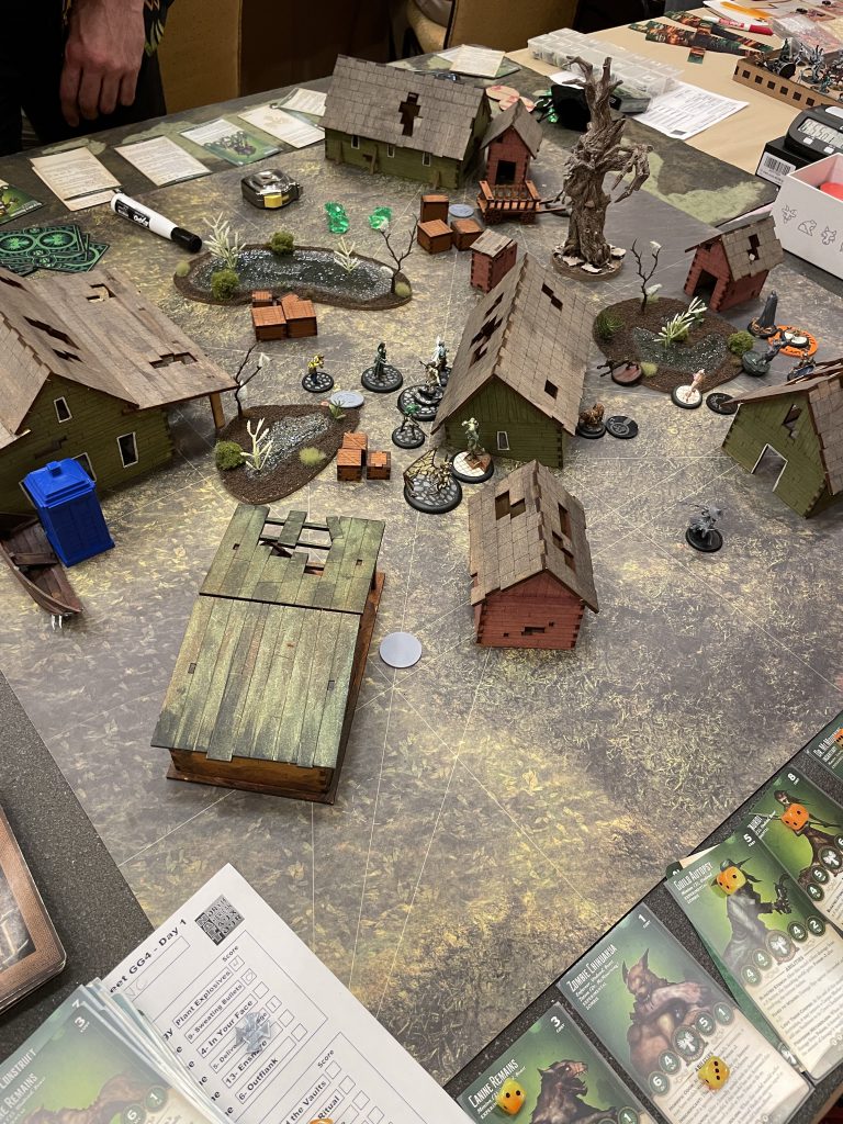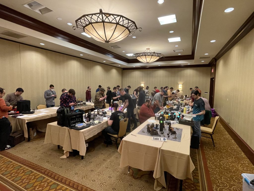 Luckily, my third-round opponent was Doug Bowman, which was just the pick-me-up I needed. Doug's from the Texas meta, and he's a wonderful opponent; the first time I ever played him, at Gencon 2021, he ran Titania with second master Marcus and hired the Malisaurus Rex, a delightful combo. He's also an amazingly skilled painter and terrain designer (several of the Captaincon tables were his contributions) so our game was as fun to watch as to play. I wish I had taken some pictures.The pool was Cloak and Dagger on Wedge deployment, with Death Beds, In Your Face, Hold Up Their Forces, Take Prisoner, and Let Them Bleed in the pool. This was a pretty clear Clampetts pick for me, and Doug declared Titania. One thing was for sure - the table was going to be covered in terrain markers.