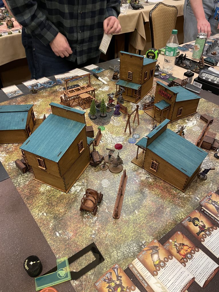 Pic unrelated, but I love the Old West table. Som'er Teeth Jones is playing into Jedza, I think: wisdom and mystic power vs. uh, not those things. Credit: Jesse ETurn 1 he dithered in his deployment zone with the Crooligans, making Schemes for Molly to eat for cards and gaining activation control via Constructive Criticism, while giving the Valedictorian Fast. He made his move late in the turn, diving the Bushwhacker on the left flank, though I was able to force him to cheat so I could Scamper away and avoid being killed. Only temporarily - that Whacker's days were numbered. On the other side I played cagey, not taking potshots at Archie, which was probably a mistake; without Focus it's very hard for him to oneshot a whacker, and if I can make him cheat I can limit him to one attack. Archie is a fat sack of HP but he's also Df 4, and Crit Strike guns can very quickly put him in the dirt.
